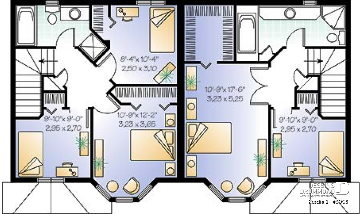 À l’étage, qu’il s’agisse de l’option deux chambres ou l’option trois chambres, on constate, une fois de plus, une maximisation de l’espace disponible avec une minimisation de l’espace corridor permettant d’accéder aux chambres et à la salle de bain. Cette dernière propose, peu importe l’option, un bain séparé d’une douche à la plus grande satisfaction des propriétaires qui seront comblés par une chambre des maîtres donnant dans le volume en baie et ce, peu importe l’option.