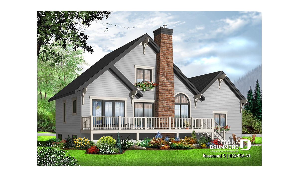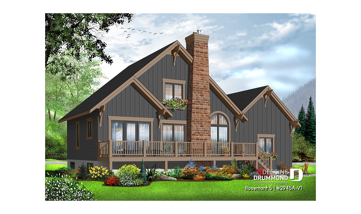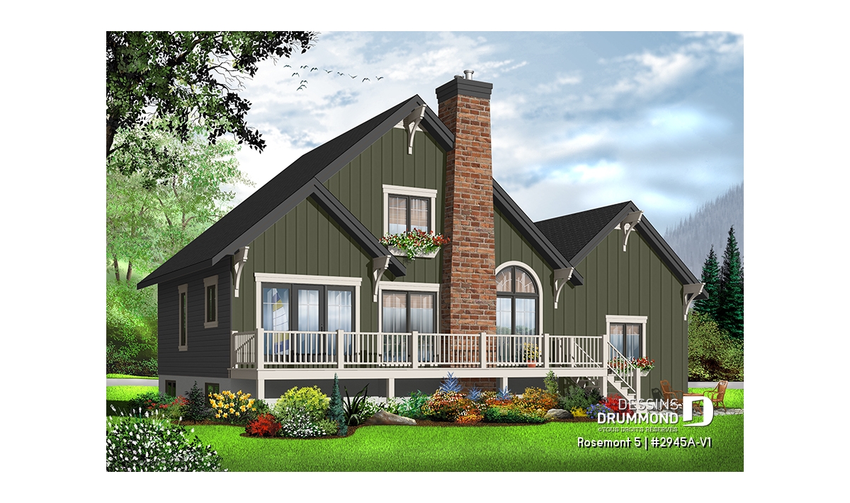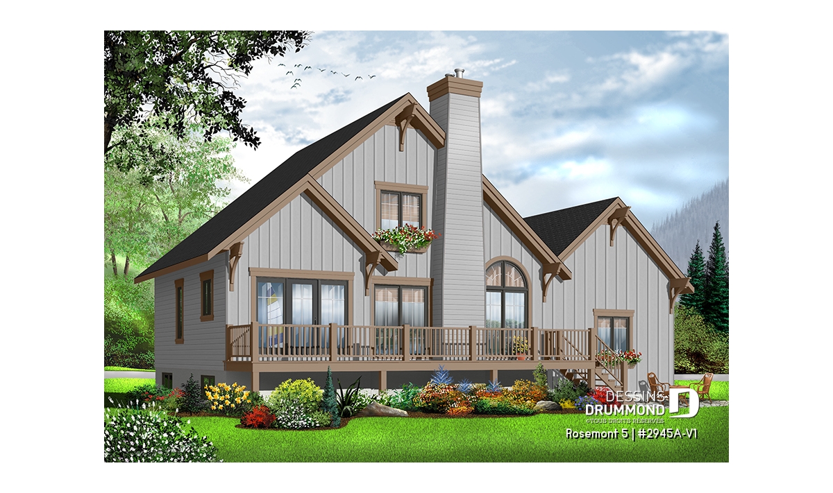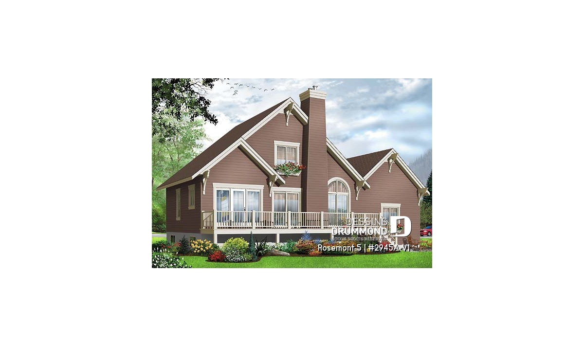 Après avoir mis de l’avant le modèle 2945A, qui est le modèle inversé du plan d’origine numéro 2945, Dessins Drummond vous propose ce 2945A-V1 qui se veut la version avec garage de ce modèle de style chalet tant convoité. On retrouve sur celui-ci, à un abri-moustiquaire près, tous les éléments distinctifs qui ont fait la popularité du modèle.