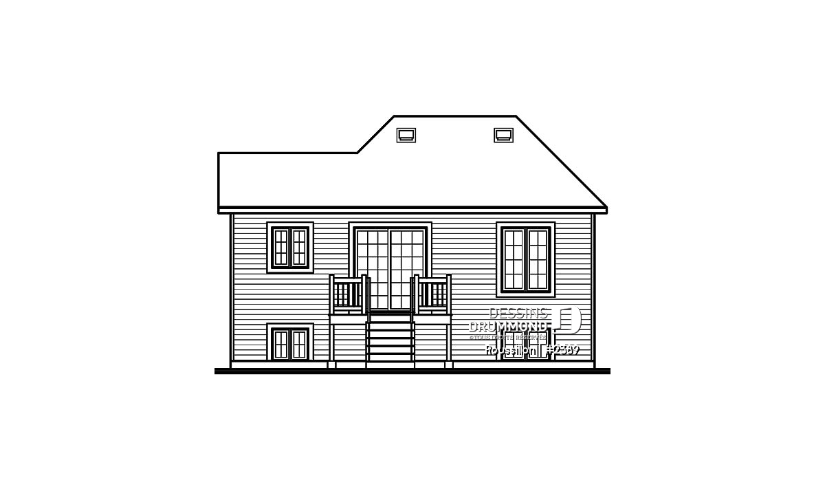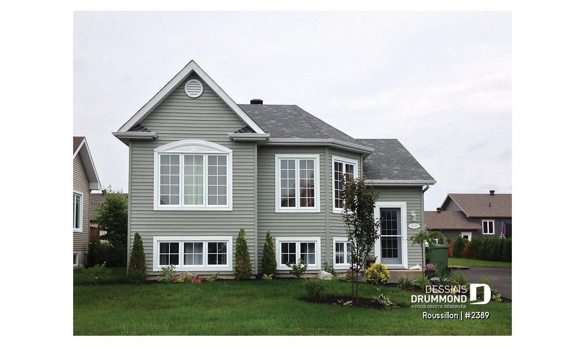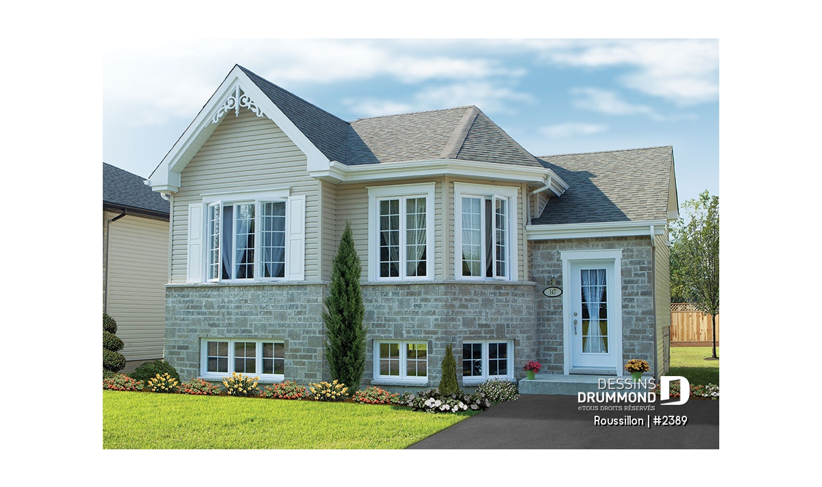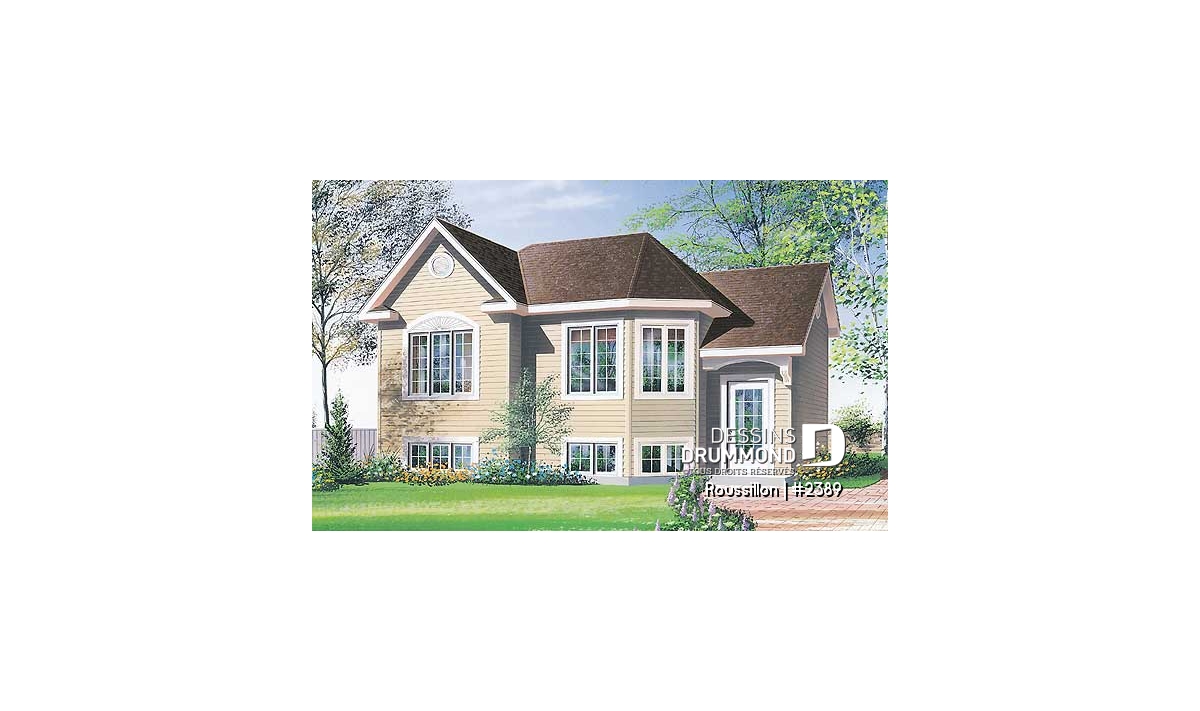 Plan de maison split level, 2 chambres, garde-robe à l'entrée, espace ouvert, coût abordable