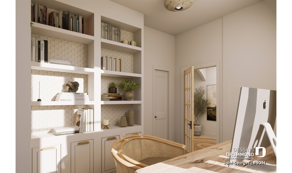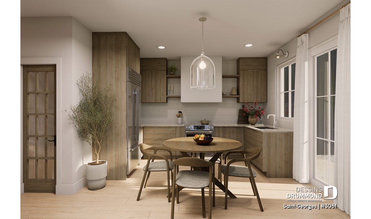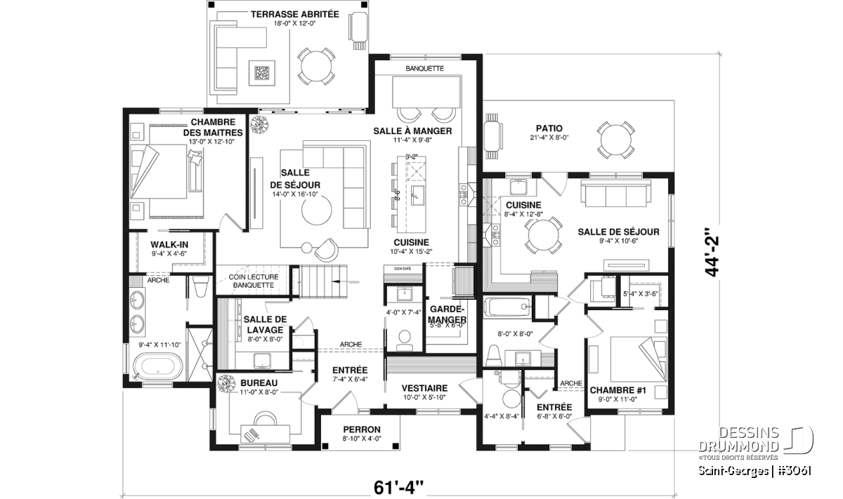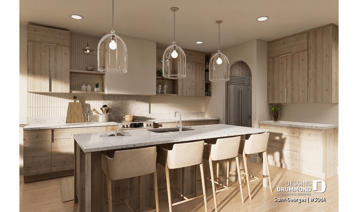 Arche, Aire ouverte, Garde-manger, Plafond à plus de 8', Terrasse abritée, Salle de lavage au rez-de-chaussée, Walk-in ch. maîtres, Ilôt, Banquette, Bain et douche séparés, Lavabo double, Bureau / Salle étude, Suite des maîtres au rdc