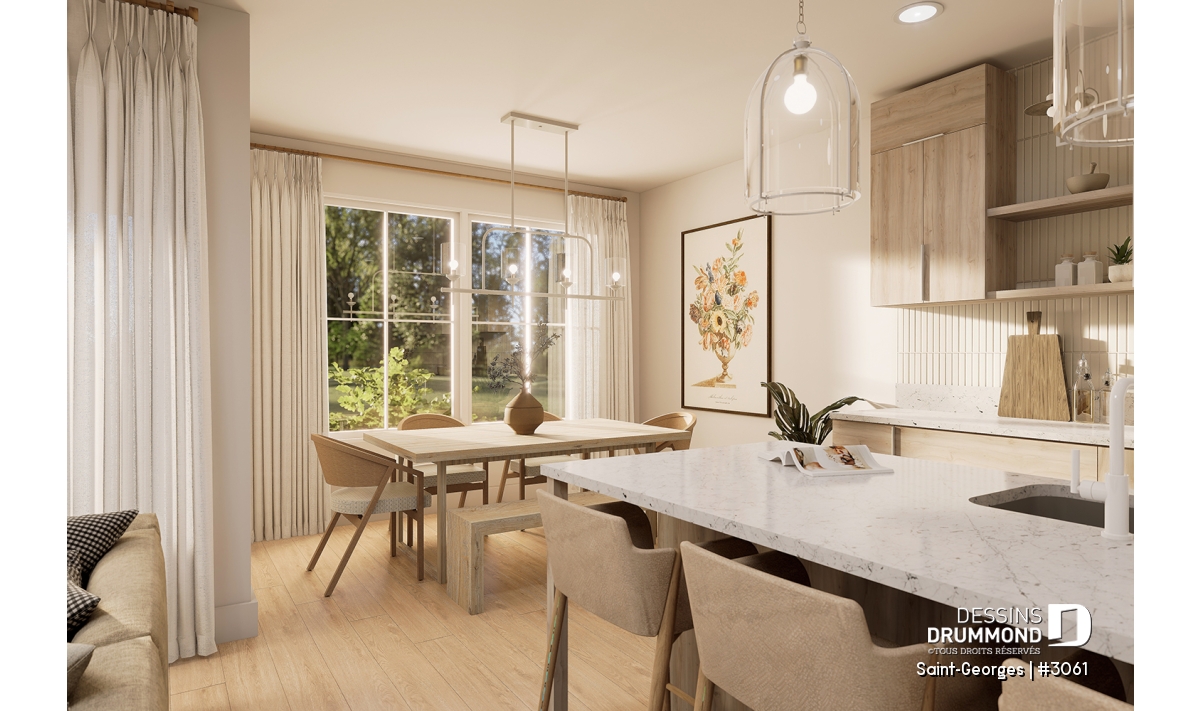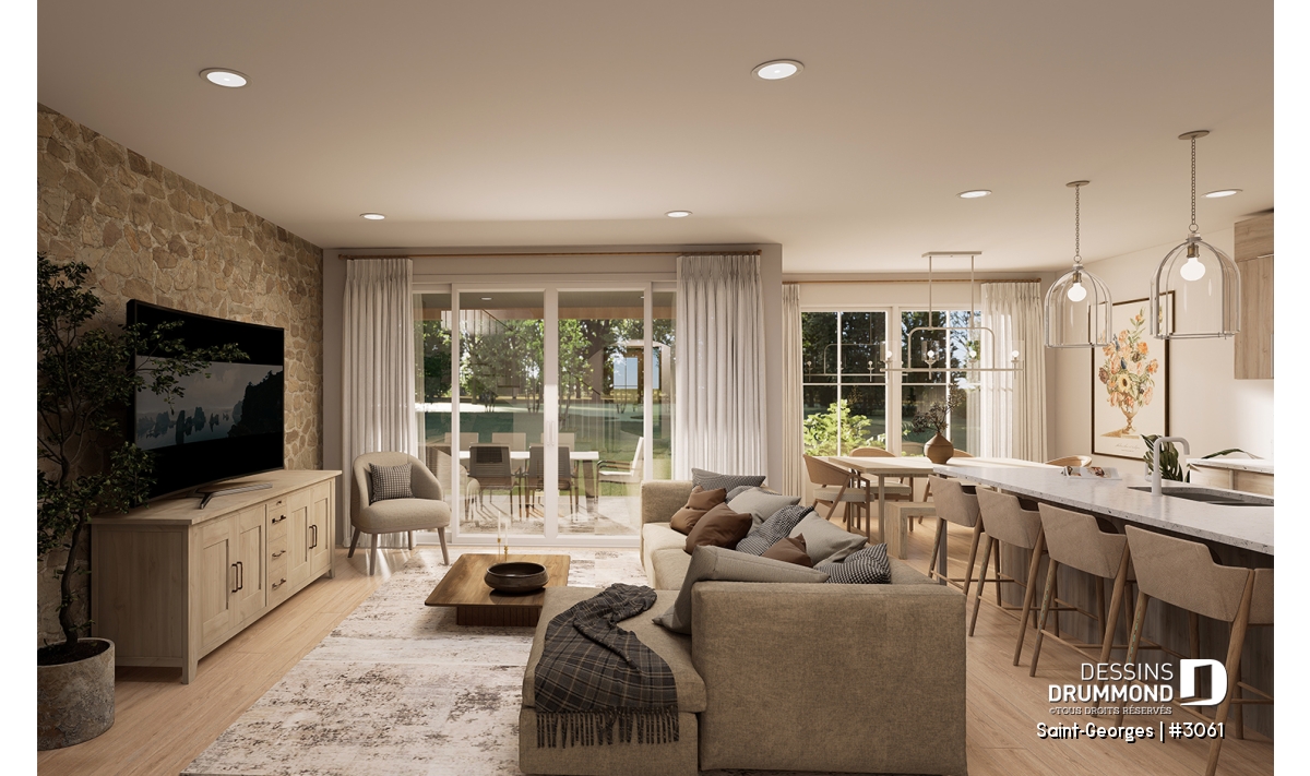 Le salon à aire ouverte donne sur la cuisine conviviale, avec un grand îlot central et un garde-manger pour plus de rangement.