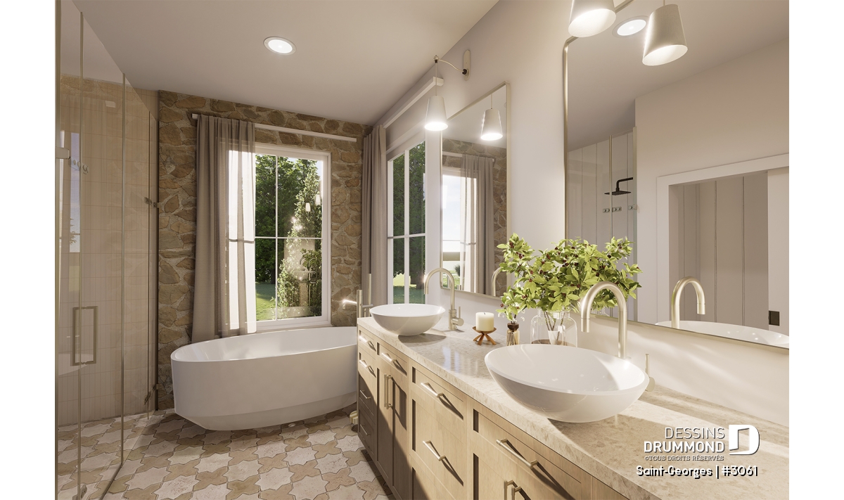 La chambre des maîtres propose un walk-in de bon format et une salle de bain privée avec bain et douche séparés, en plus de deux lavabos.
