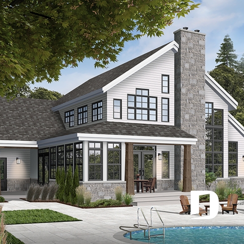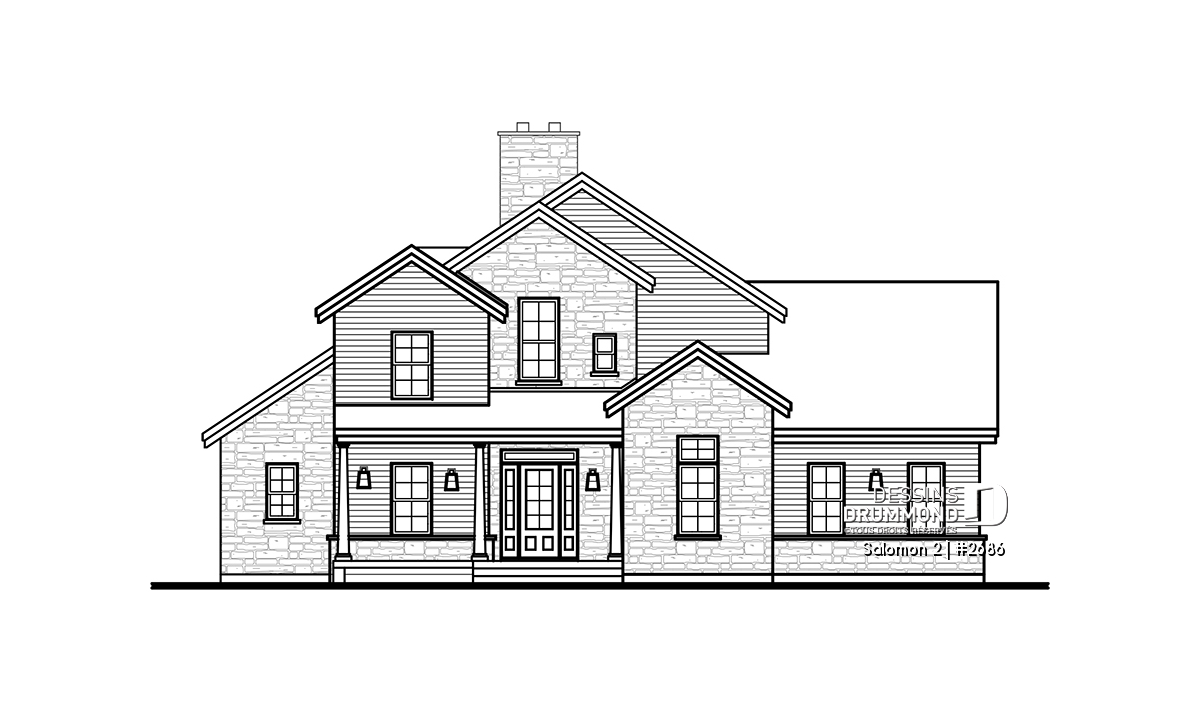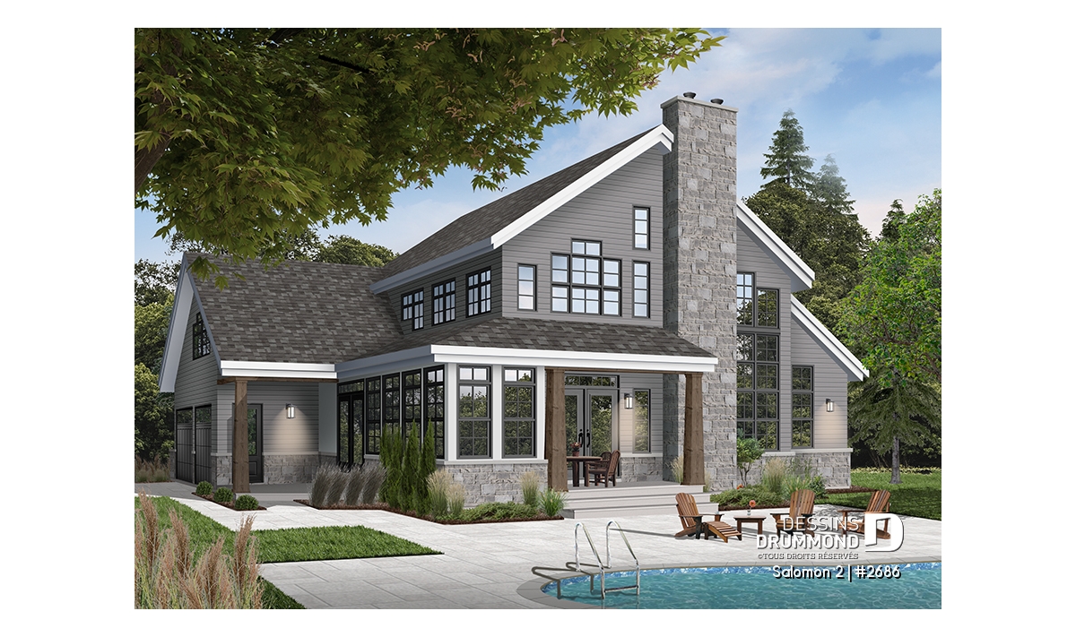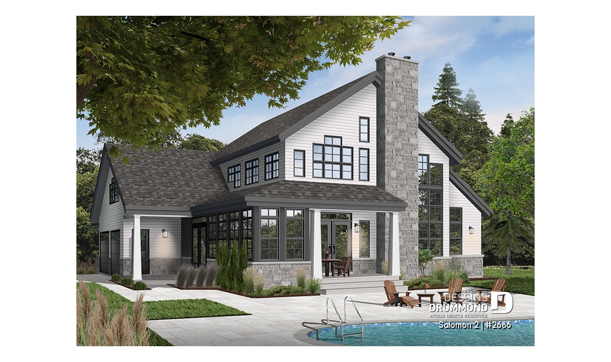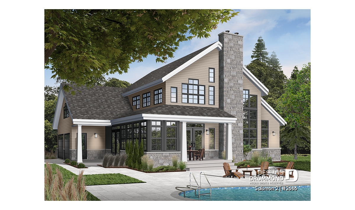 Conçu d’abord et avant tout pour répondre aux besoins spécifiques d’un concours de design résidentiel américain dont : une surface totale maximale de 2000 pi2 ( excluant garage, espace boni, verrière et sous-sol ), une chambre des maîtres et une verrière indépendante au rez-de-chaussée ainsi qu’un garage double, le modèle 2686 a suscité l’intérêt escompté dès son arrivée sur le marché et nous a d’ailleurs obligé à lui faire une version similaire soit le modèle 2611. Lors du même concours, Dessins Drummond a aussi proposé le modèle 2688 pour lequel la verrière se traduit par une tourelle entièrement vitrée sur l’arrière de la maison et à laquelle on a intégré un escalier en colimaçon afin d’accéder à l’ensemble des plantes en suspension. À voir sur http://www.dessinsdrummond.com/