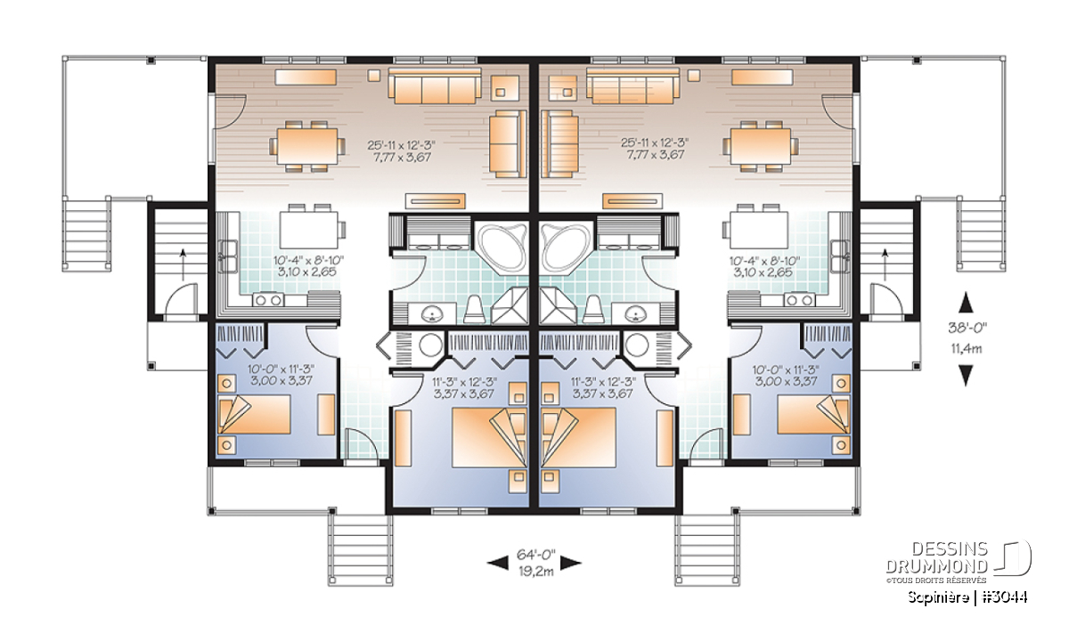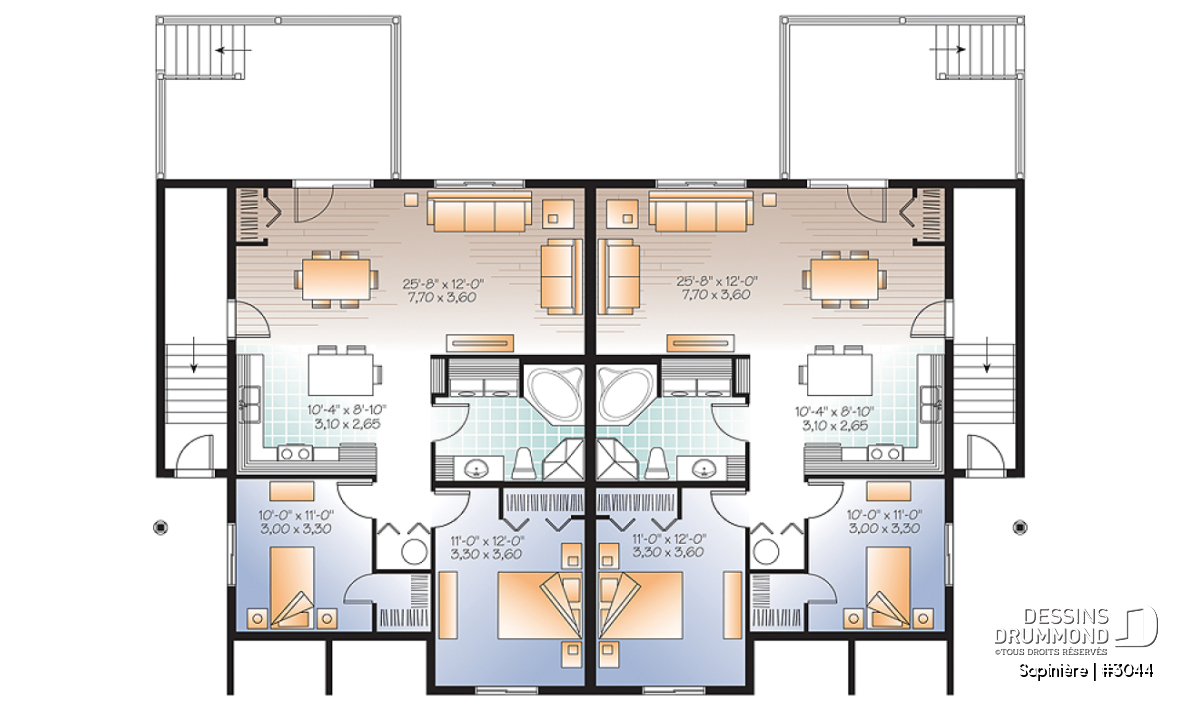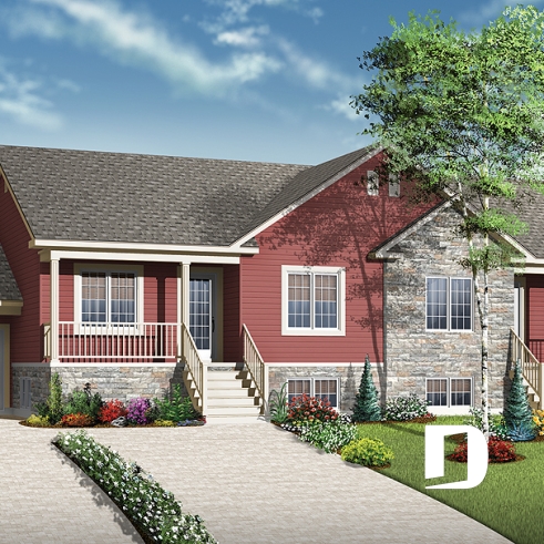 Dessins Drummond vous suggère ici un plan de 4 logements fort intéressant aux allures champêtres, avec cette combinaison de pierre et déclin, et dont l’aménagement de deux logements en demi-sous-sol permet la réalisation d’une construction à coût plus abordable ( le sous-sol étant pleinement utilisé ) tout en conservant une belle luminosité intérieure en raison des grandes fenêtres attribuées aux secteurs activités localisés à l’arrière.