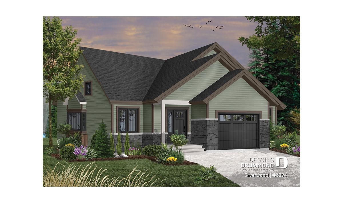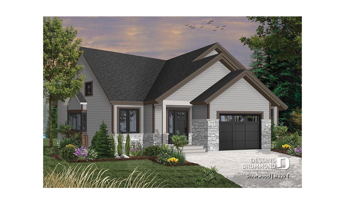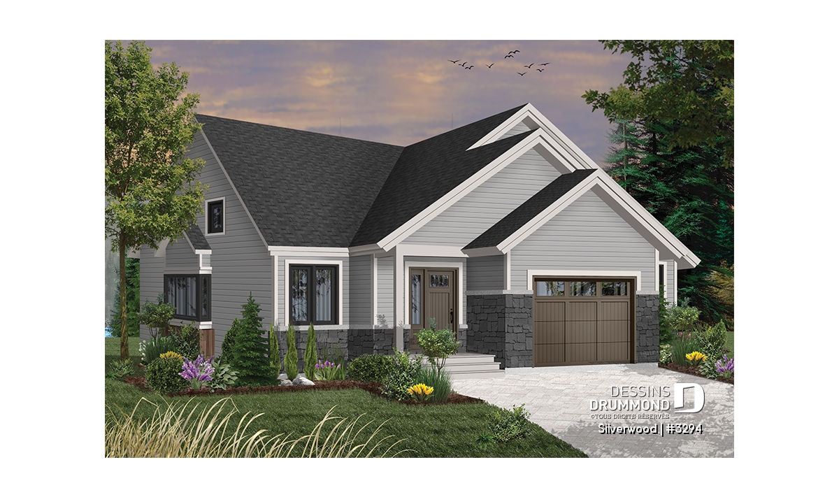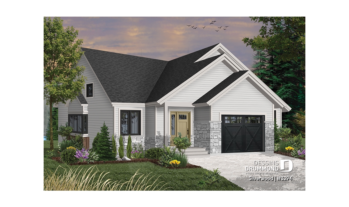 Ce nouveau plan de maison de plain-pied 3 chambres avec garage, plan no. 3294 de Dessins Drummond, aussi nommé Silverwood, propose un aménagement pratique de toutes les chambres et airs communs sur un seul et même plancher. Cette formule plait généralement aux familles avec jeunes enfants, permettant ainsi aux parents d’être à proximité de leurs jeunes.
