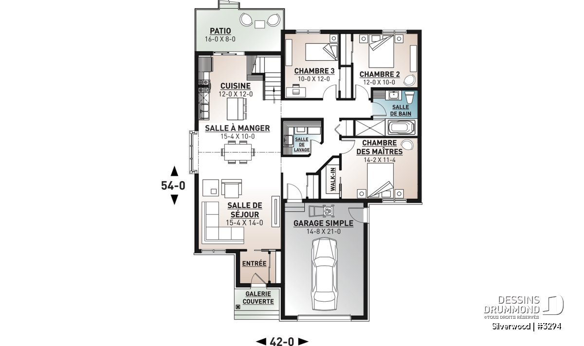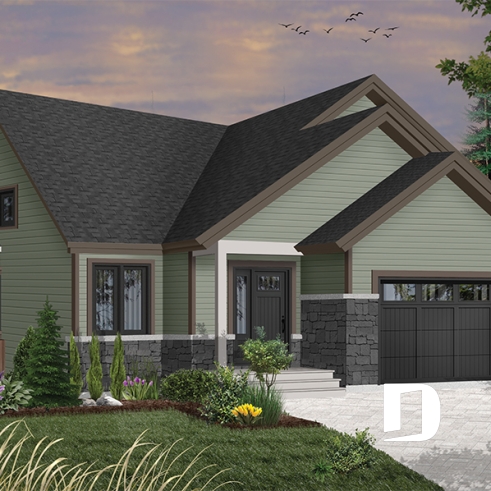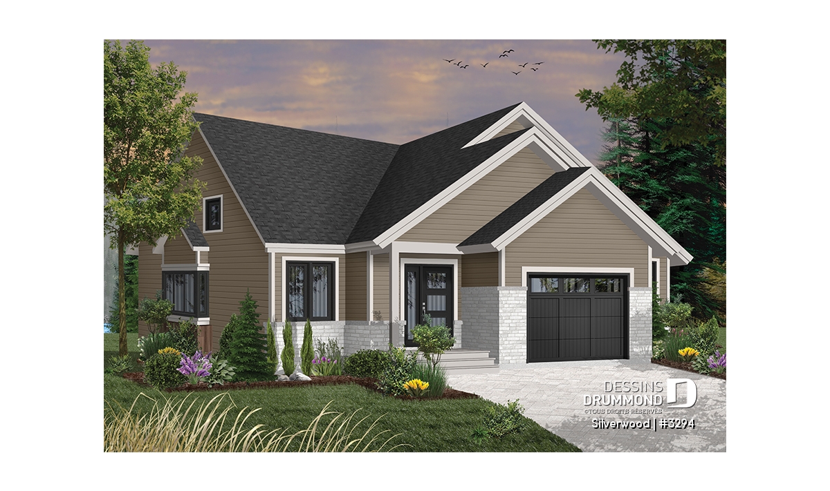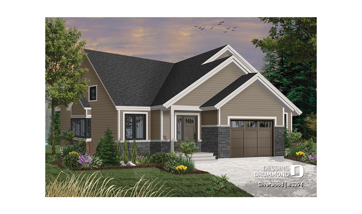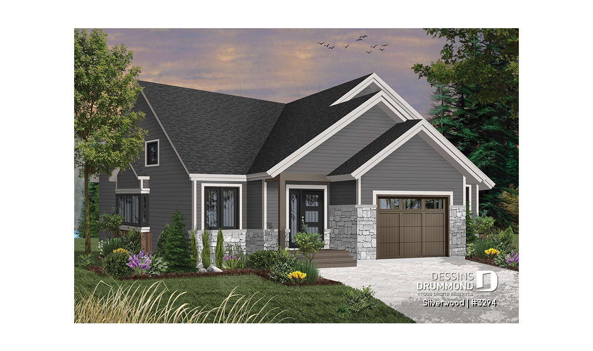 Ce nouveau plan de maison de plain-pied 3 chambres avec garage, plan no. 3294 de Dessins Drummond, aussi nommé Silverwood, propose un aménagement pratique de toutes les chambres et airs communs sur un seul et même plancher. Cette formule plait généralement aux familles avec jeunes enfants, permettant ainsi aux parents d’être à proximité de leurs jeunes.