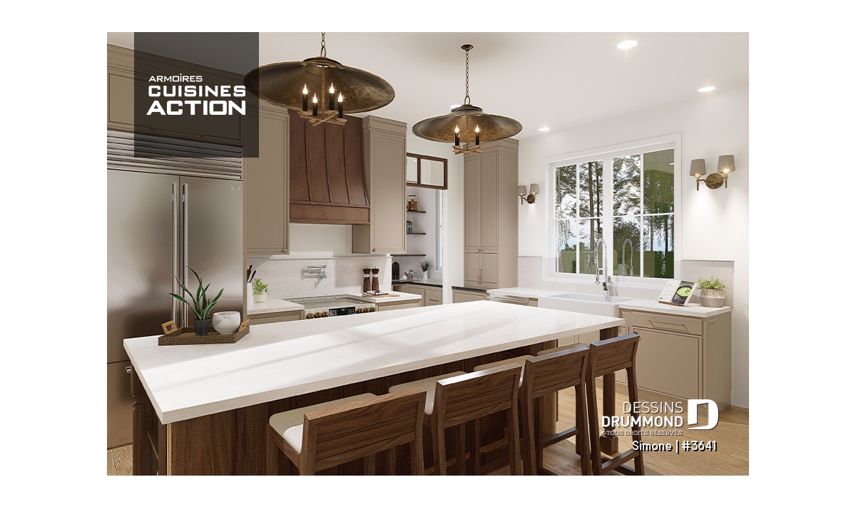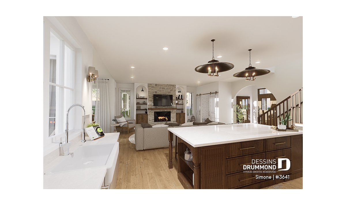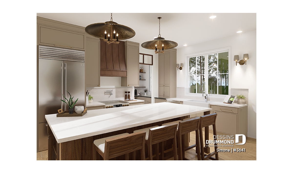 La cuisine est vraiment le coup de coeur de cette maison pour l'immensité des rangements qui y sont proposés, à commencer par l'arrière cuisine et le garde-manger. De plus un grand îlot central, ouvert sur la salle de séjour, vous permettra de cuisiner tout en gardant le contact avec vos invités. La salle de manger, avec plafond cathédral, est très lumineuse grâce à l'élégante fenestration qui y est aménagée. Un foyer central saura donner une ambiance chaleureuse à vos soirées cinéma en famille ou entre amis.