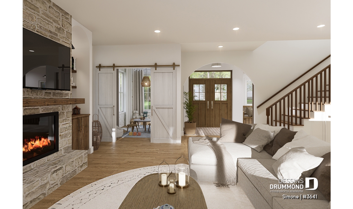 Pratique petite salle de jeux avec porte de grange, en retrait du salon.