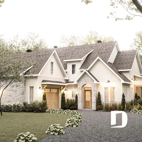 Maison de style campagne française en forme de L, idéale pour terrain profond.
