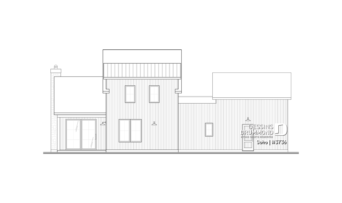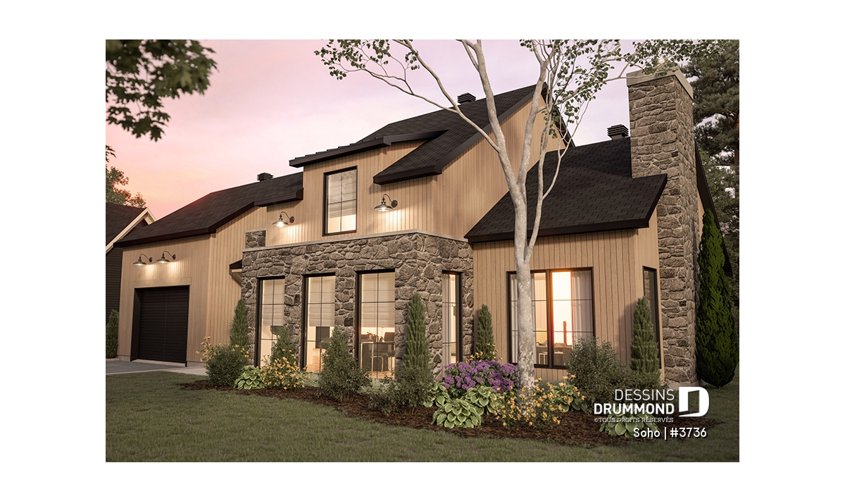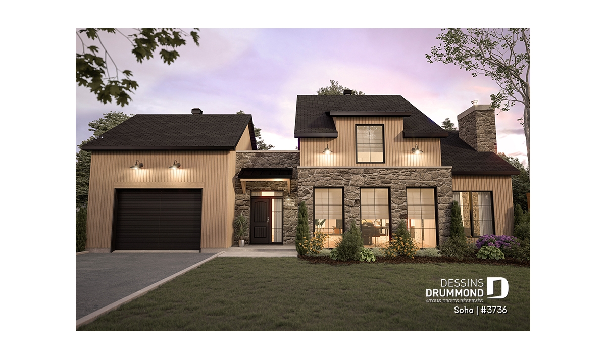 Vue avant - MODÈLE DE BASE - Maison de style transitionnel à aire ouverte, suite des parents au rez-de-chaussée, bureau à l'étage - Soho