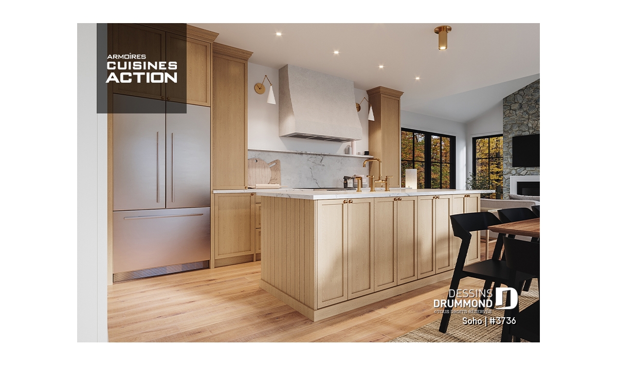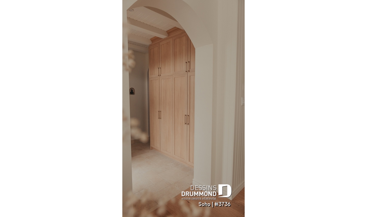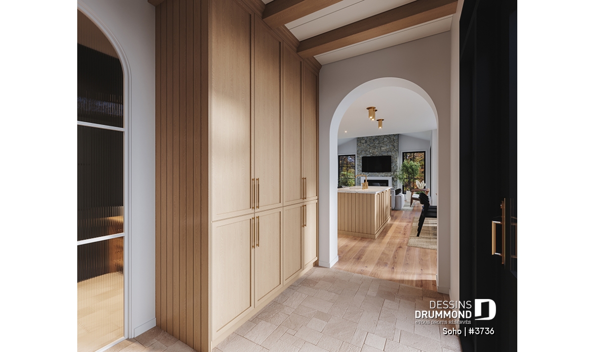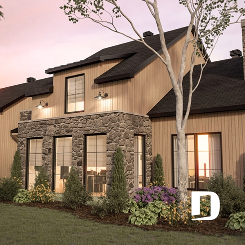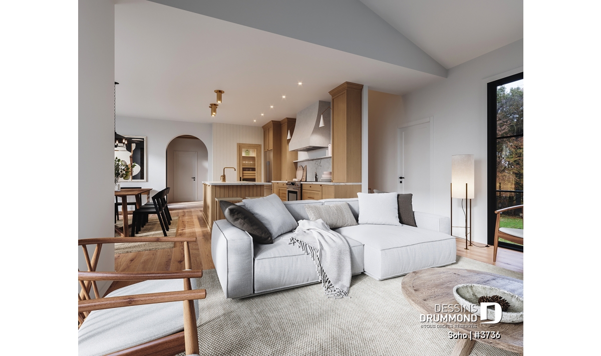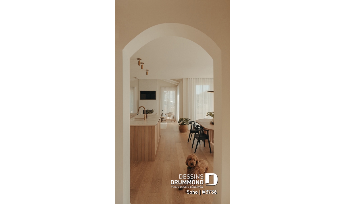 Aire ouverte, Espace boni aménageable, Foyer, Garde-manger, Ilôt, Plafond cathédrale, Salle de lavage au rez-de-chaussée, Suite des maîtres au rdc, Terrasse abritée, Bureau / Salle étude, Arche, Auto-Construction