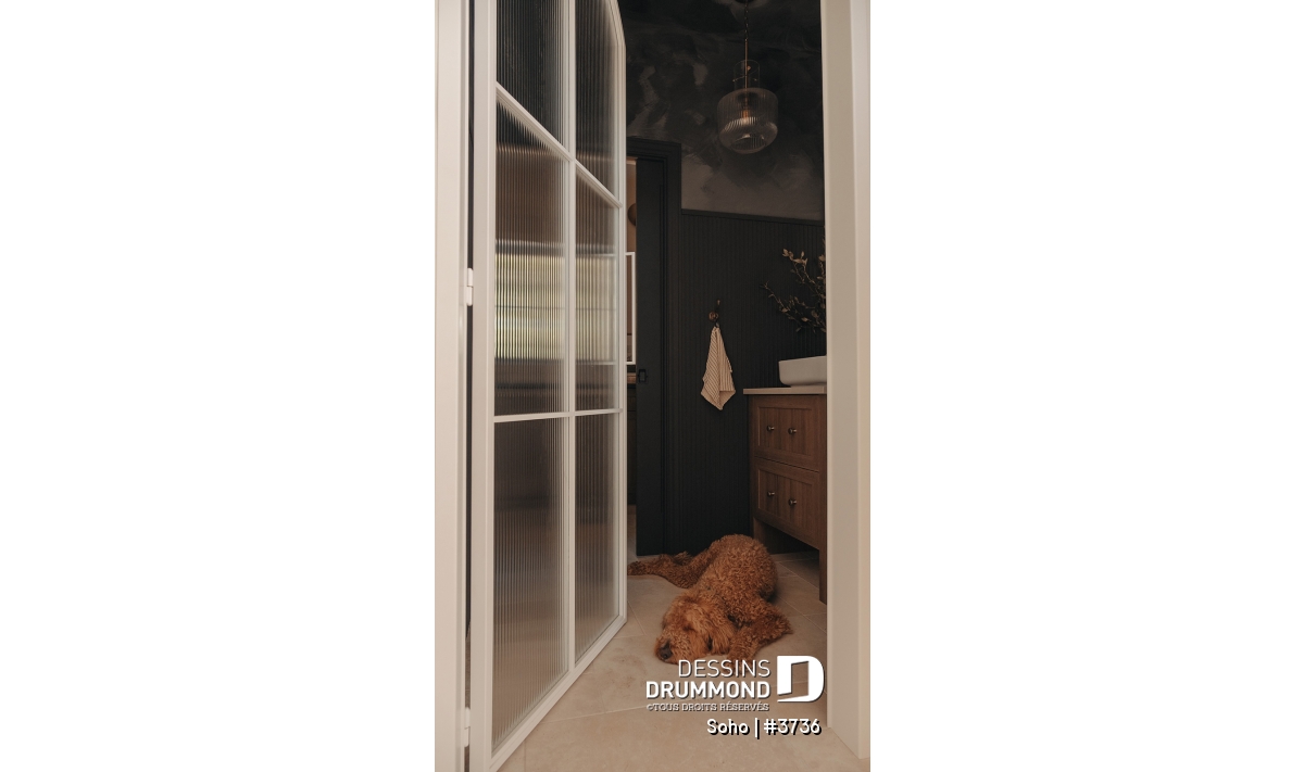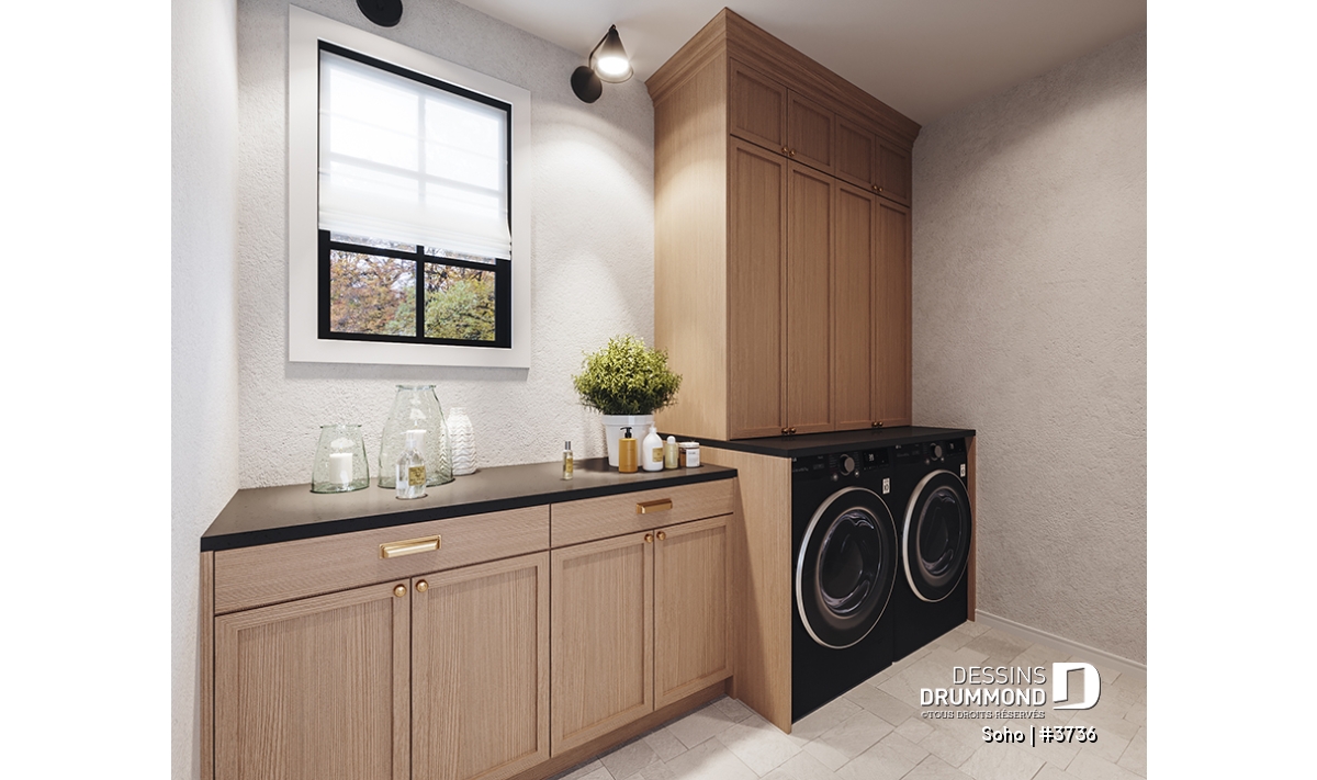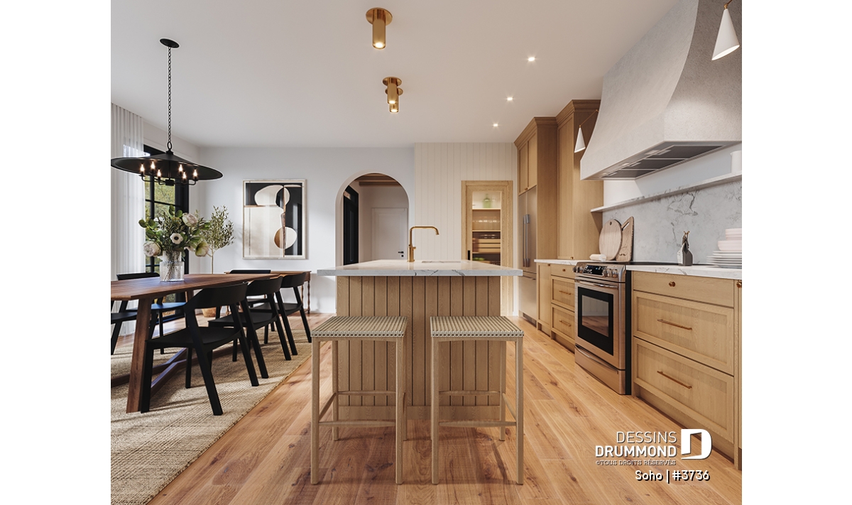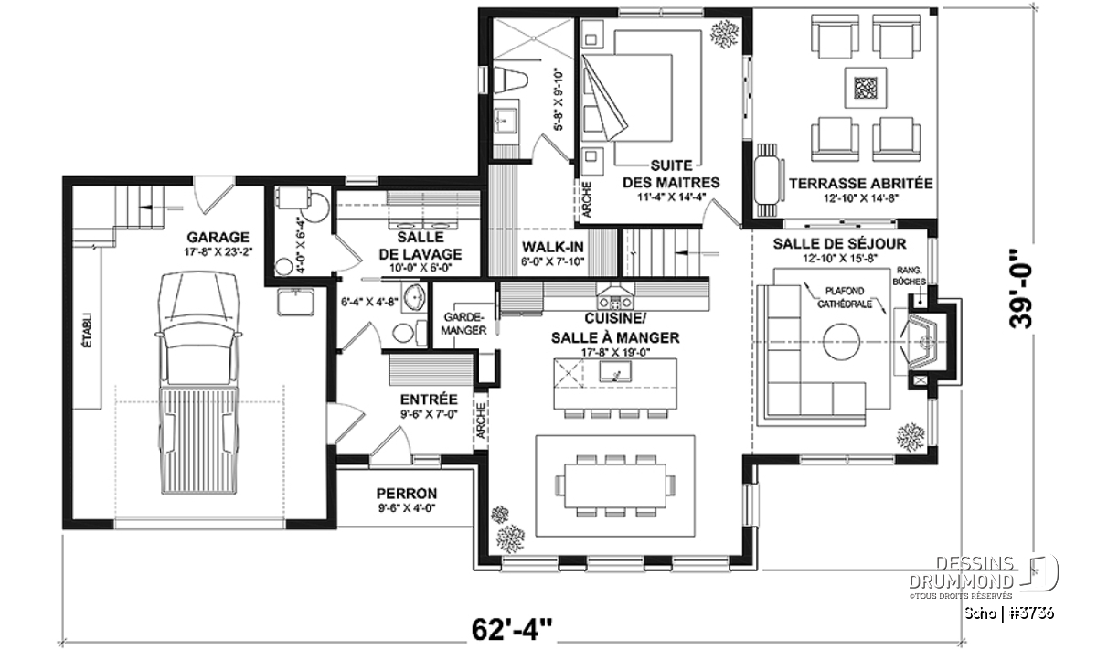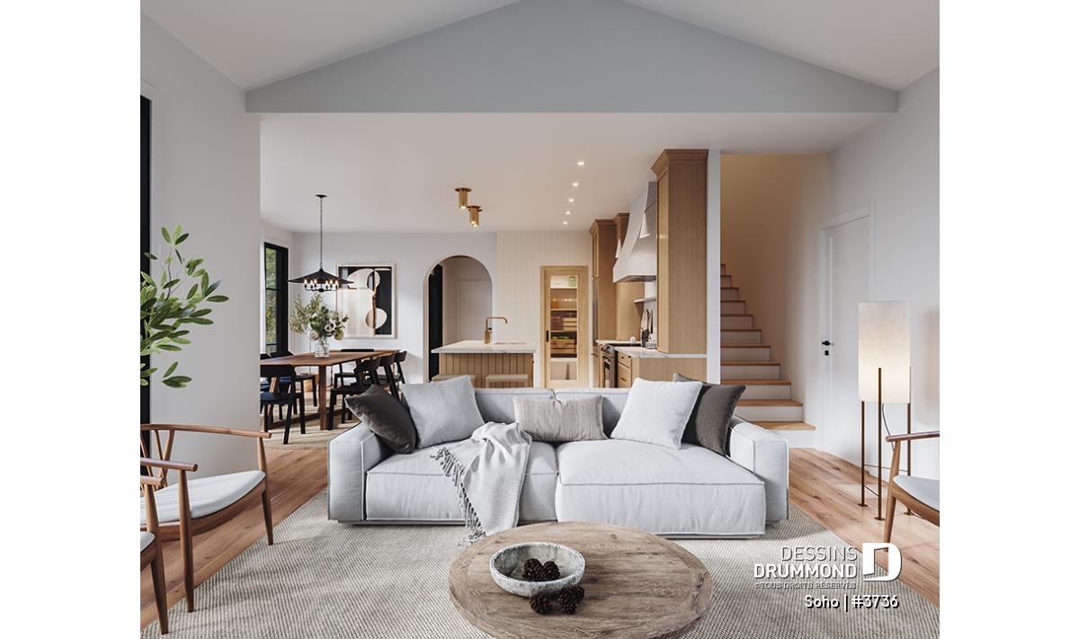 Aire ouverte, Espace boni aménageable, Foyer, Garde-manger, Ilôt, Plafond cathédrale, Salle de lavage au rez-de-chaussée, Suite des maîtres au rdc, Terrasse abritée, Bureau / Salle étude, Arche, Auto-Construction
