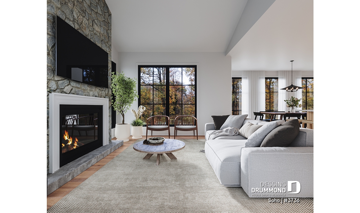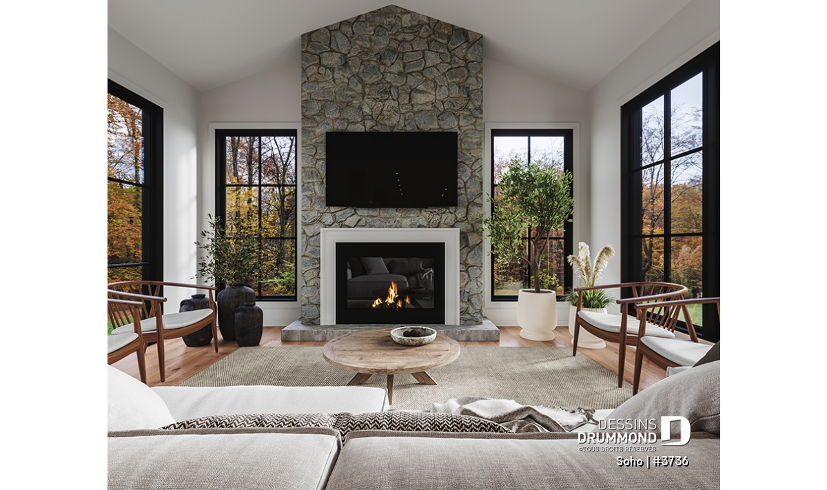 Plafond cathédrale de 11'10'' et foyer à la salle de séjour.