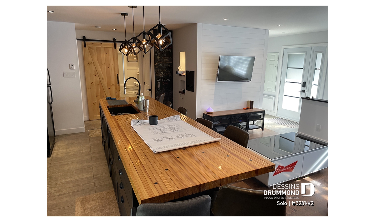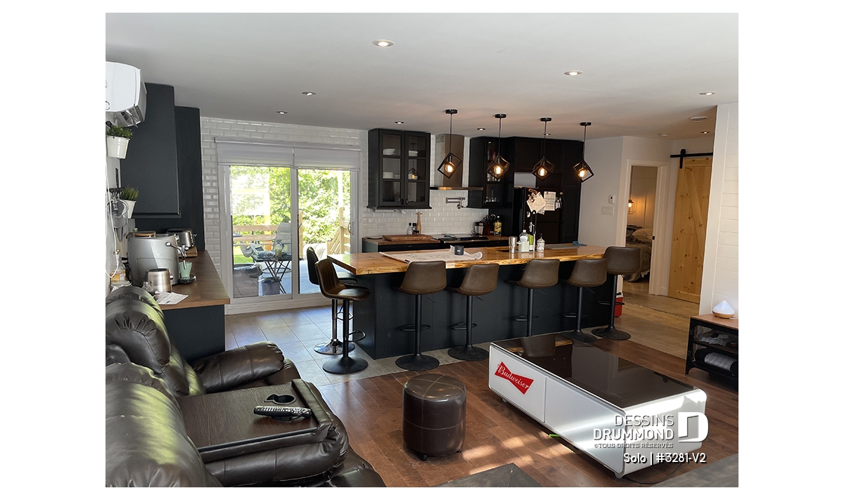 Aire ouverte entre cuisine et salon.