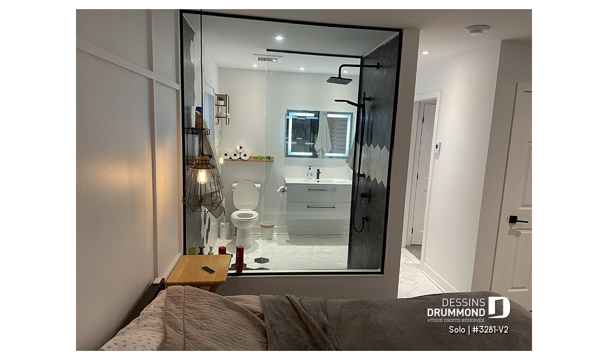 Chambre ouverte sur la salle de bain avec la douche qui sépare la chambre de la salle de bain.