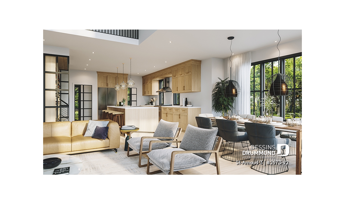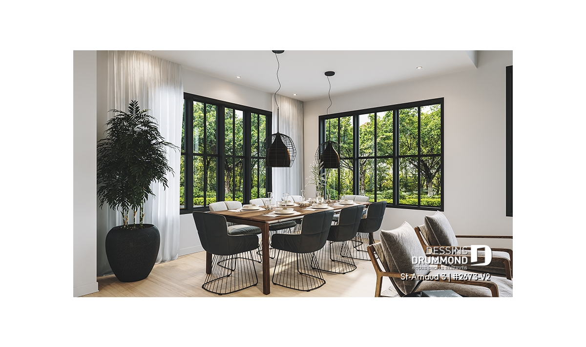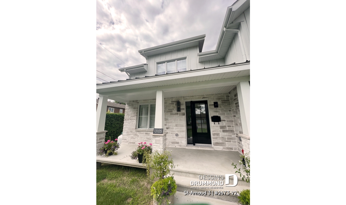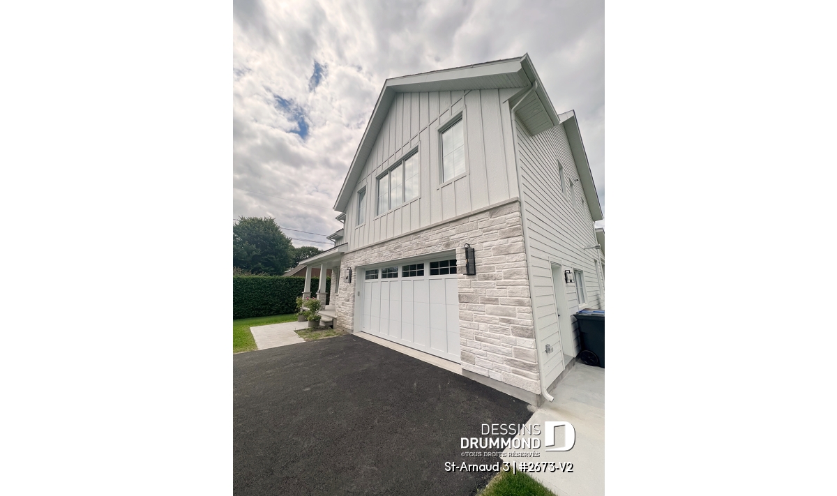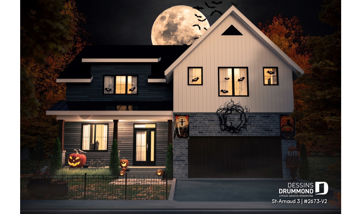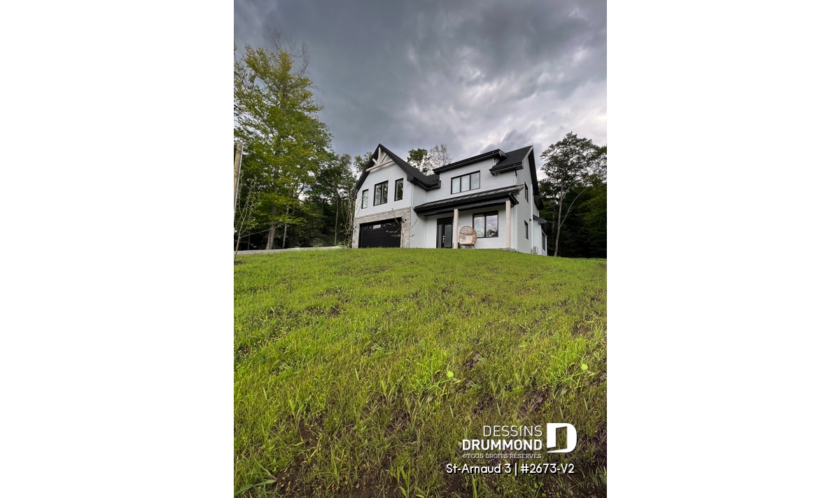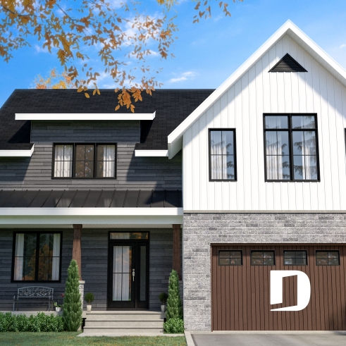 La mezzanine ouverte donnant sur la salle familiale accentue le volume et la luminosité de l’espace. Un garage double offre un accès direct et pratique à la maison. Enfin, un sous-sol à aménager selon vos besoins et plusieurs options de fondations permettent d’adapter ce plan à votre style de vie et à votre terrain.