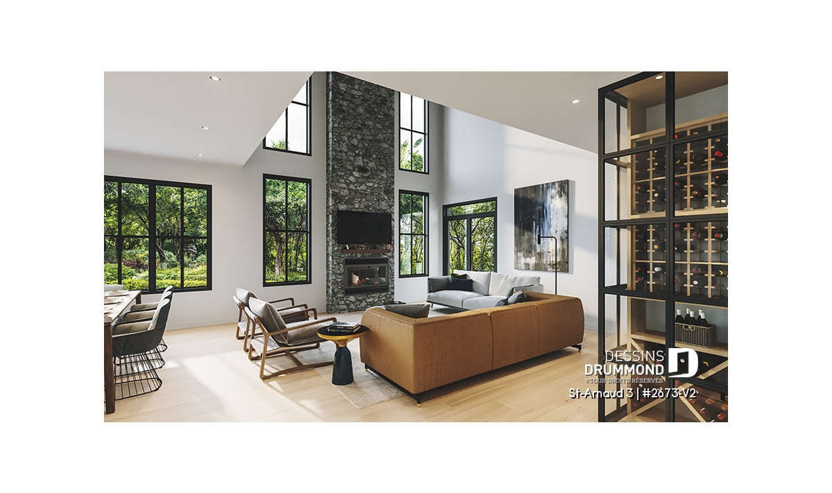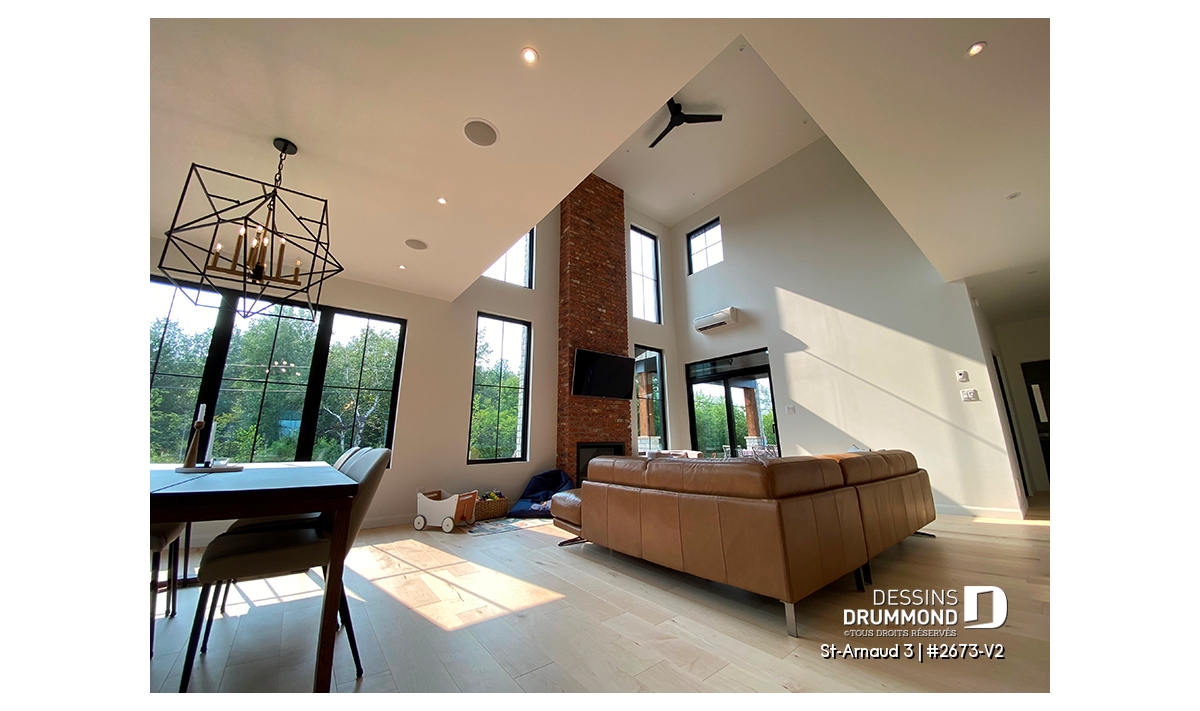 Le salon et la salle familiale se distinguent par leur foyer central sur deux étages, qui apporte une touche de charme authentique et une ambiance conviviale. Le modèle de foyer à bois proposé est le STÛV s21, reconnu pour son design élégant et sa performance. La mezzanine ouverte et le plafond cathédral donnent un effet spectaculaire et baignent l’espace de lumière naturelle, créant ainsi un lieu de détente unique où toute la famille aime se rassembler.