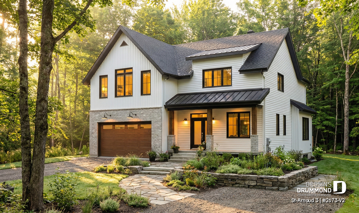 Vue avant - MODÈLE DE BASE - Plan de maison farmhouse moderne – 4 chambres, garage double et foyer spectaculaire - St-Arnaud 3