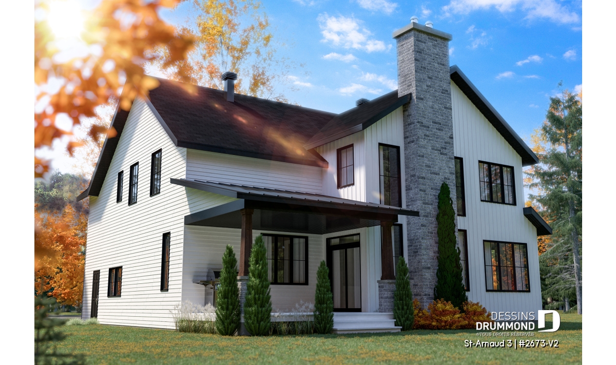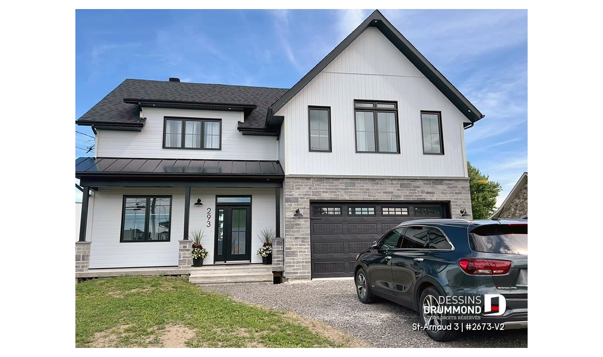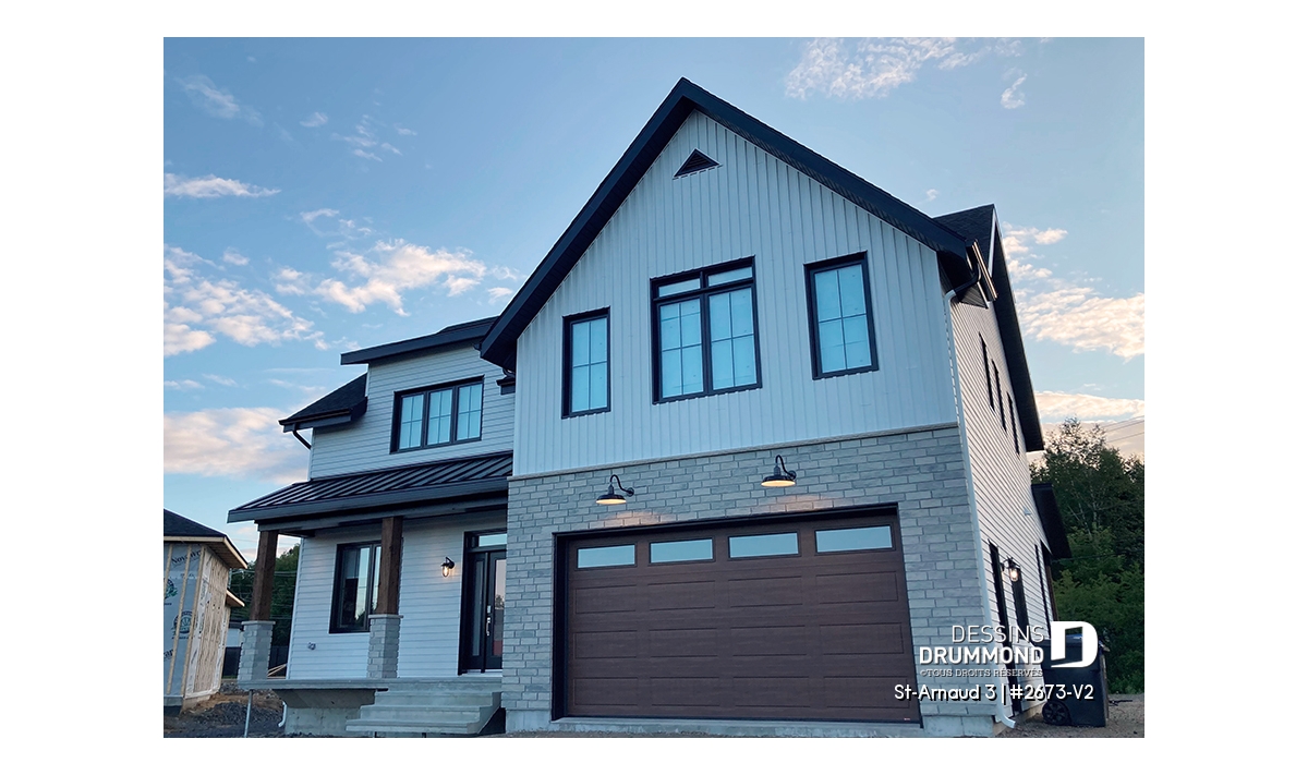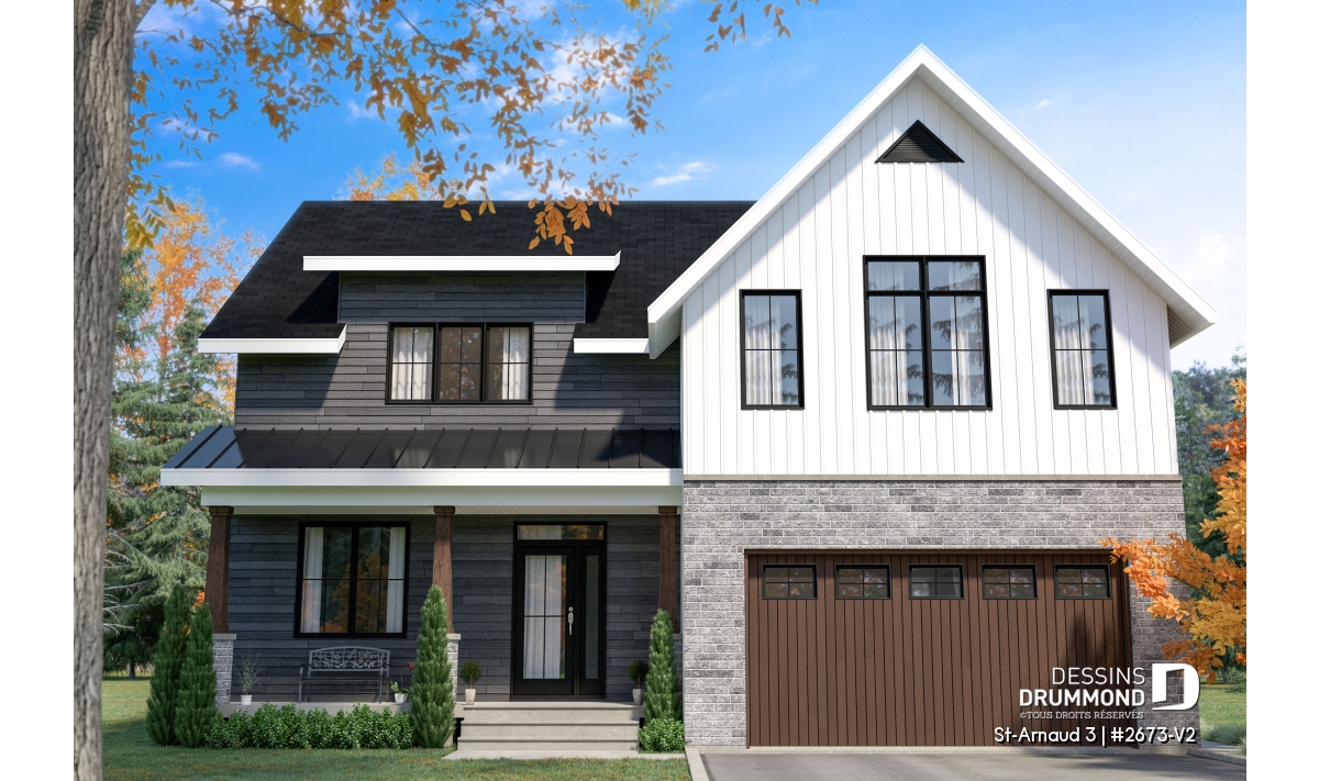 Plan de maison farmhouse champêtre avec garage double.