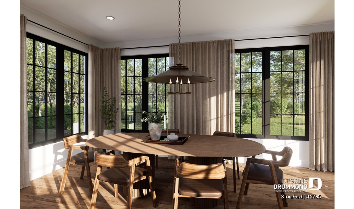 Salle à manger lumineuse, dotée de grandes fenêtres pour un maximum de clarté.