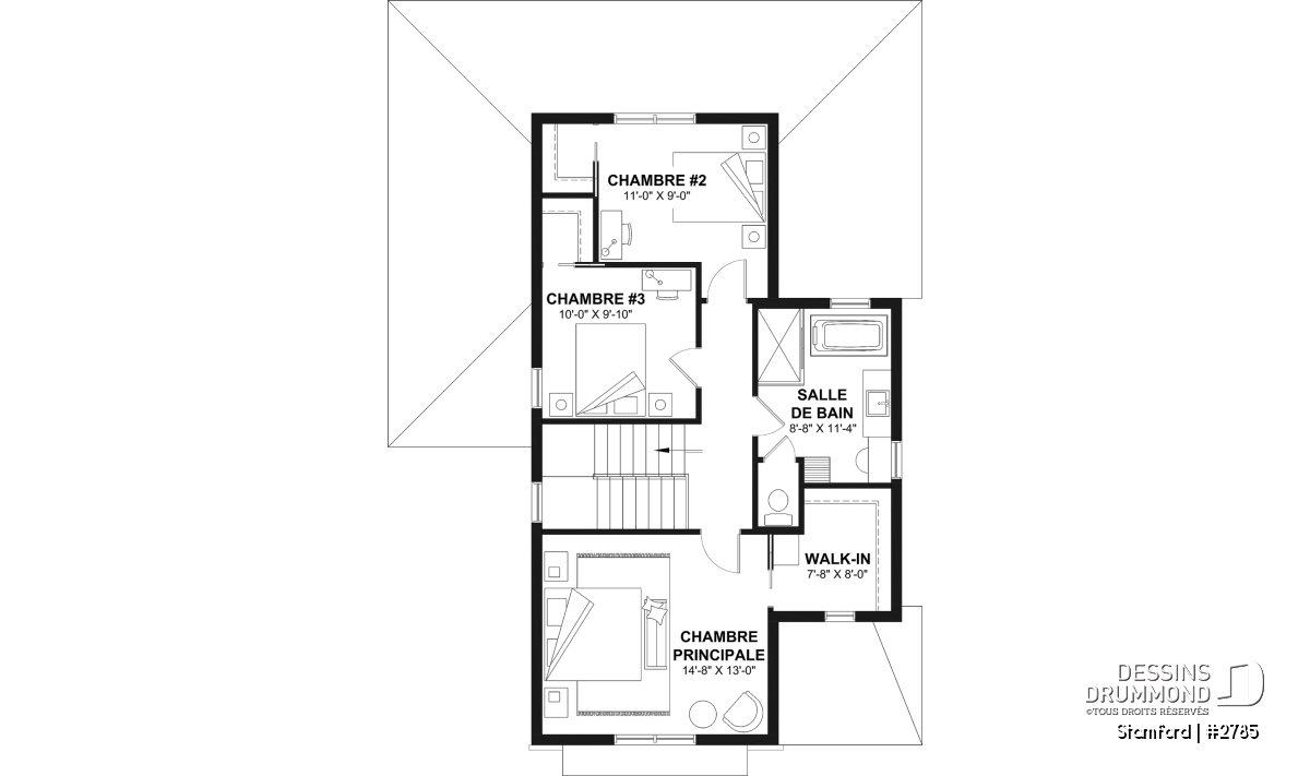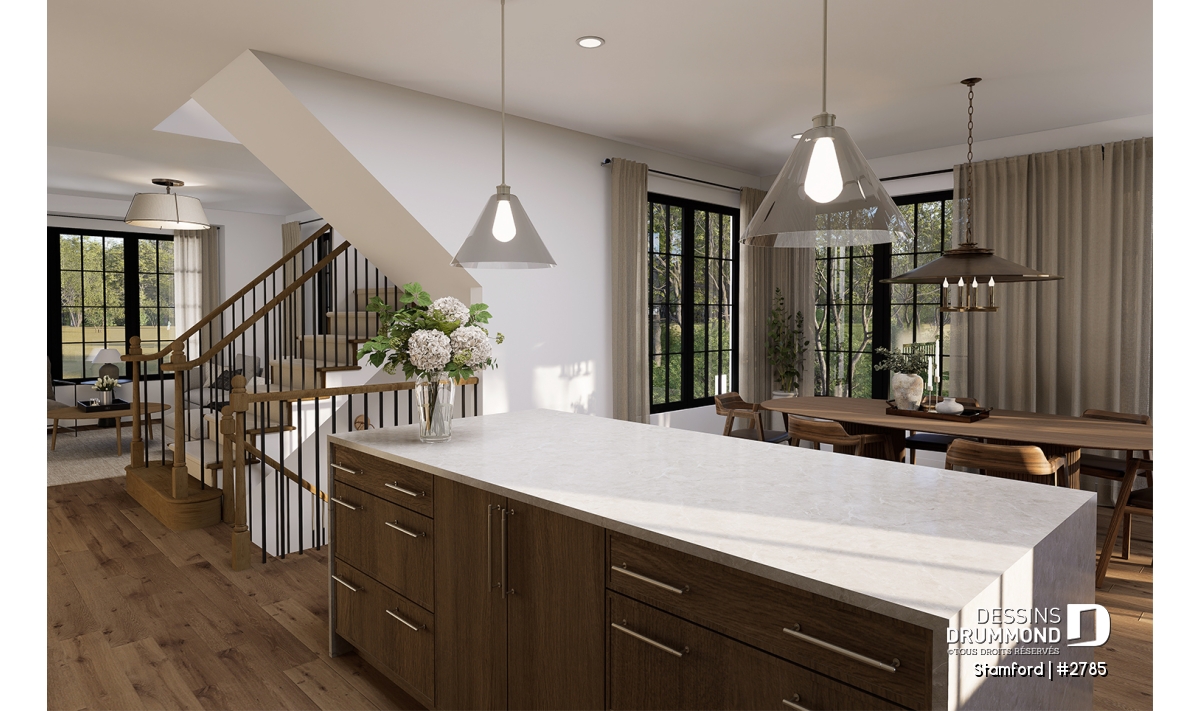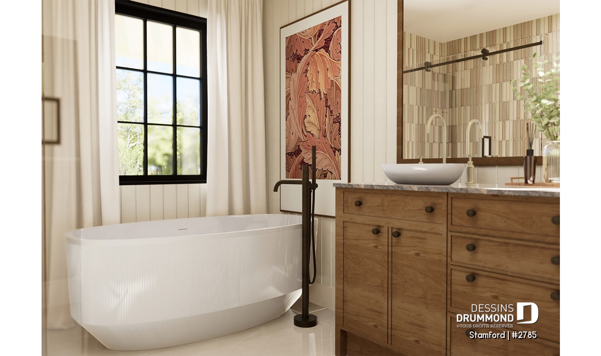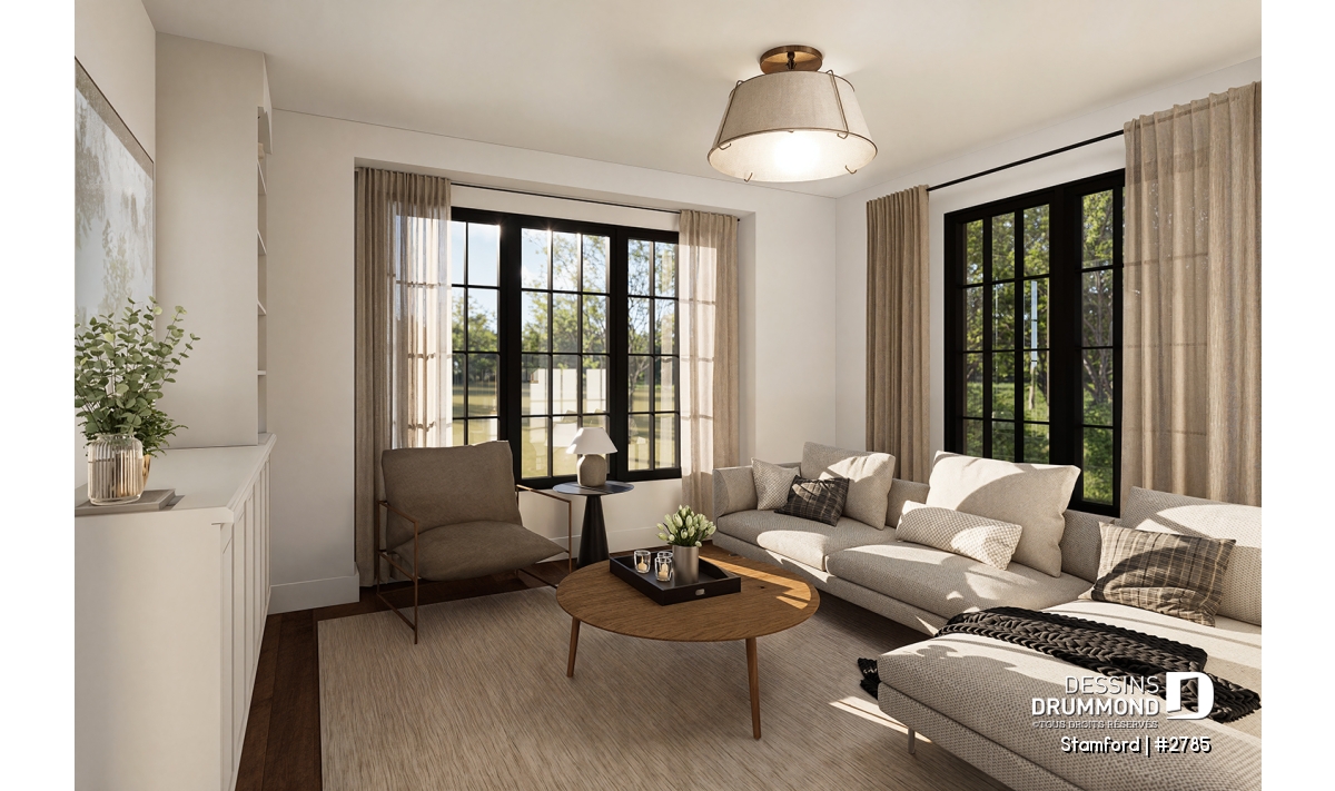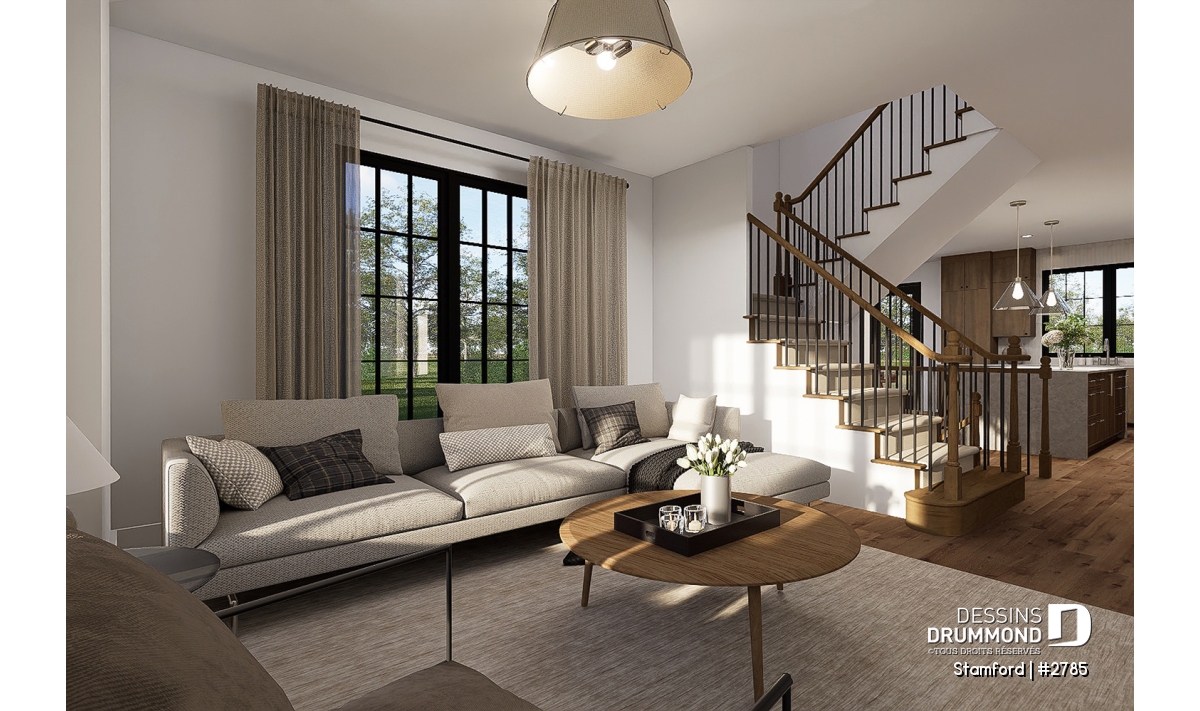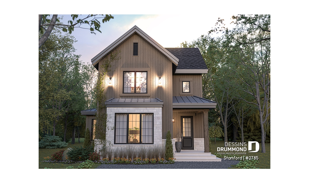 Le plan de maison STAMFORD (#2785) propose une superficie de 1864 pi² répartie sur deux étages, avec en option un sous-sol entièrement aménagé ajoutant 1040 pi² supplémentaires.