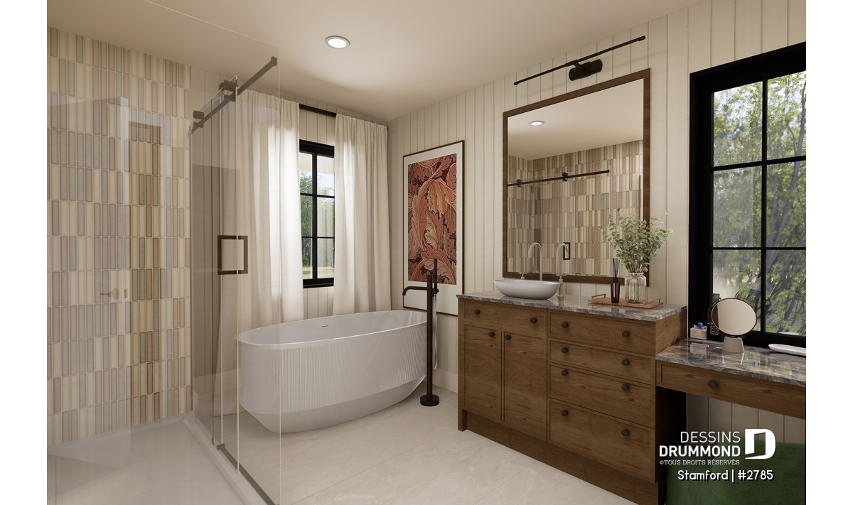 Salle de bain principale élégante, comprenant un bain indépendant et une douche séparée pour plus de confort.