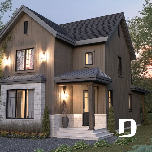 Dès le premier regard, cette maison séduit par sa silhouette épurée et sa volumétrie équilibrée. Elle charme ensuite par ses diverses saillies architecturales, qui permettent une abondance de lumière naturelle dans la salle à manger, la cuisine ainsi que dans le puits d’escalier. Grâce à son implantation en profondeur, elle s’adapte aisément aux terrains plus étroits que l’on retrouve souvent en banlieue des grandes villes. En prime, elle offre une vaste galerie couverte à l’arrière, parfaite pour profiter pleinement de l’extérieur. Entrons sans plus tarder !