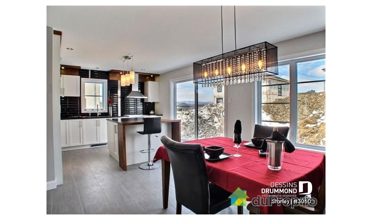 Salle de séjour tout en lumière. Secteur cuisine-salle à manger entièrement ouvert sur l'arrière. Chambre des maîtres avec deux garde-robes.