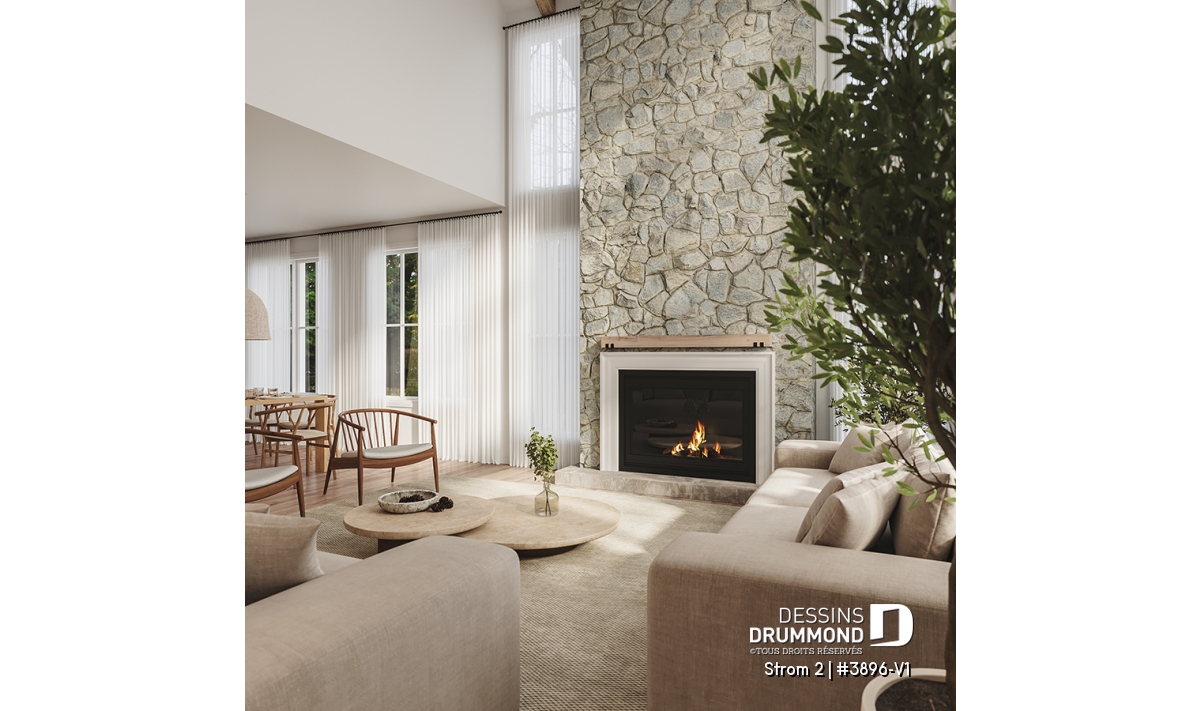 Salon lumineux avec plafond cathédrale et foyer chaleureux.