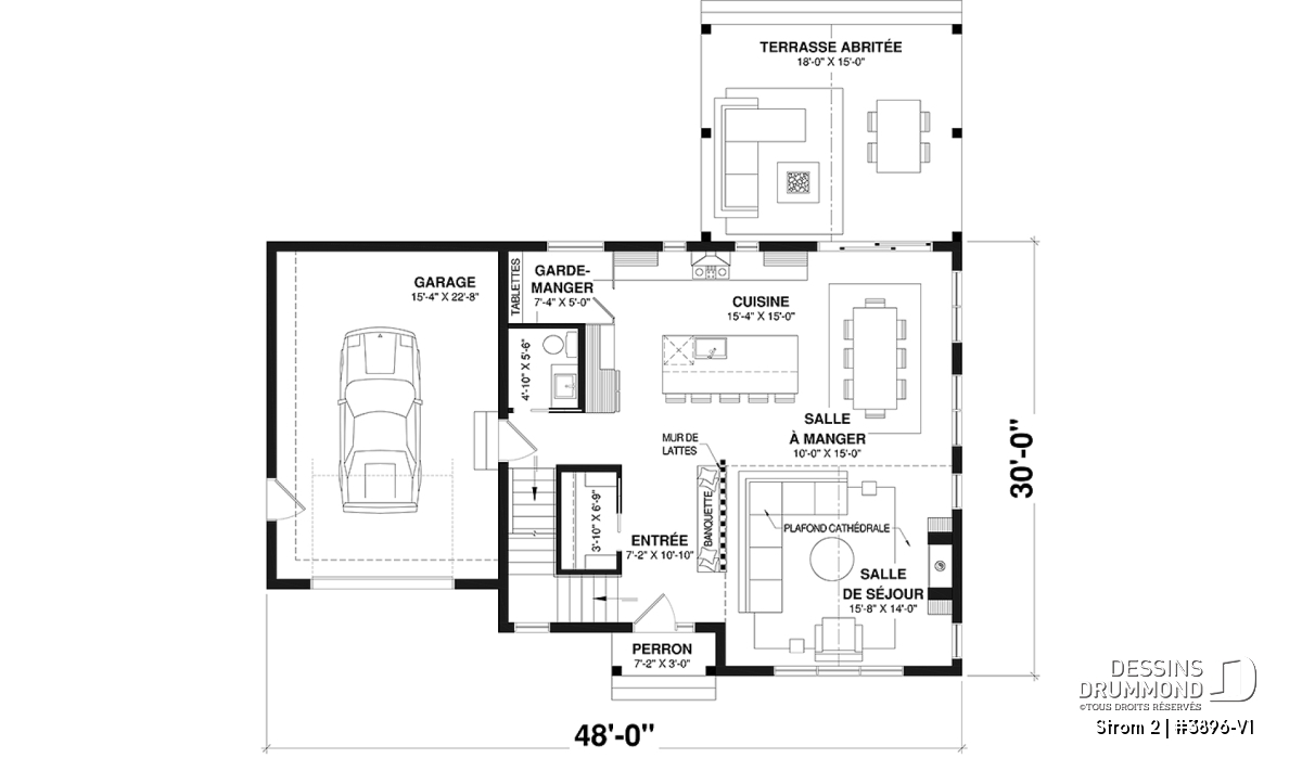 Le salon lumineux séduit avec son plafond cathédrale et son foyer chaleureux, créant un espace parfait pour se détendre ou recevoir. La cuisine fonctionnelle, avec son îlot convivial et son garde-manger, devient le cœur de la maison où se partagent repas et moments en famille. La salle d’eau discrète, habilement située à l’écart des aires communes, ajoute au confort quotidien.