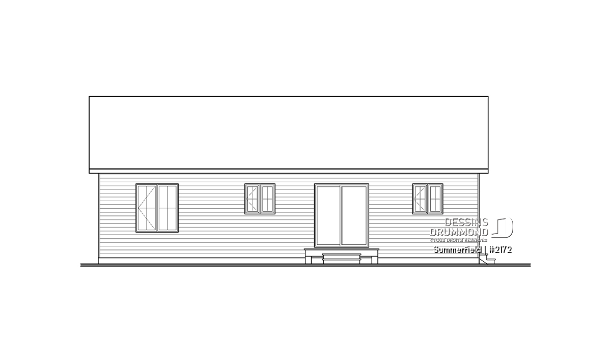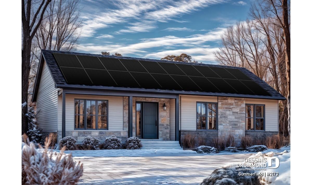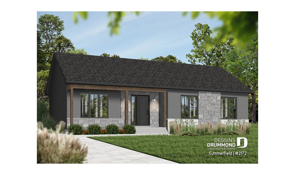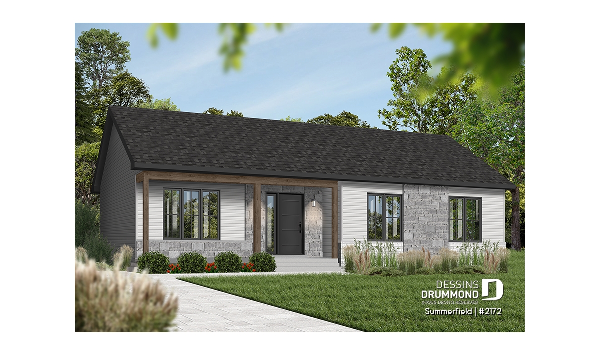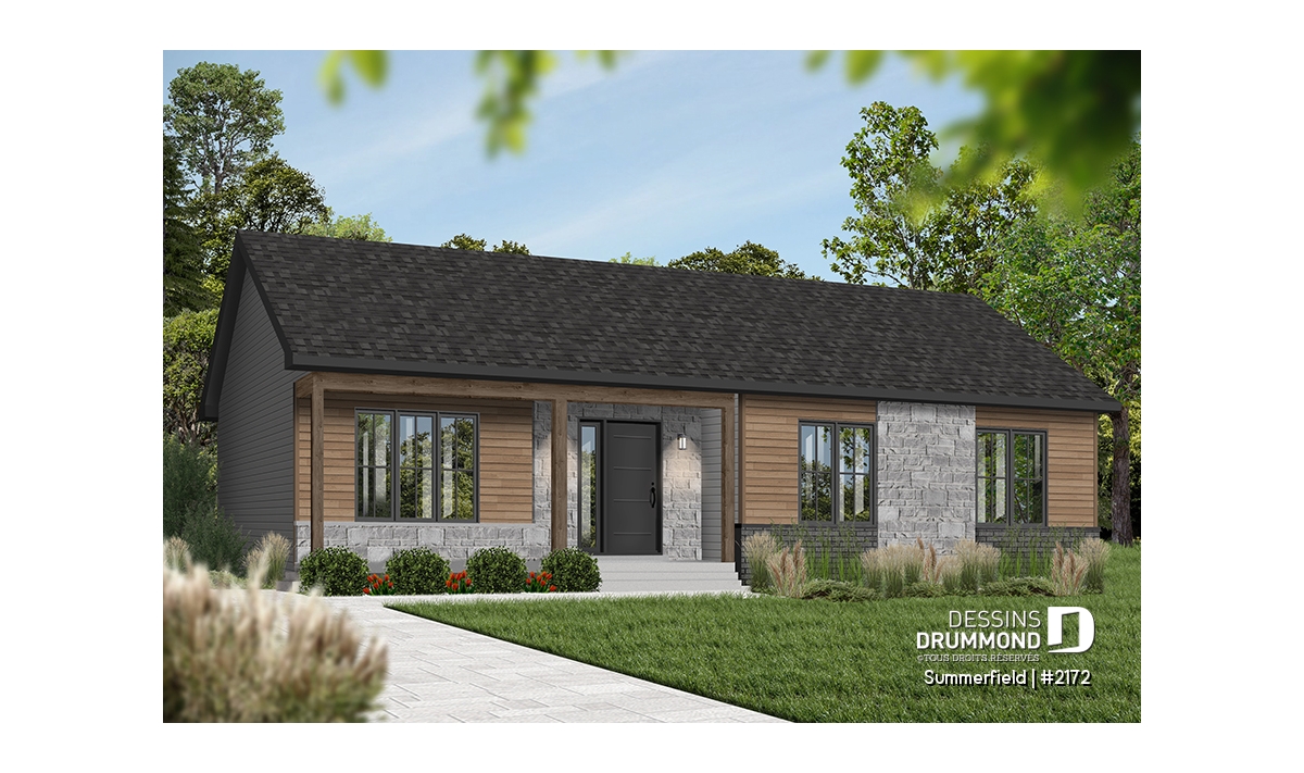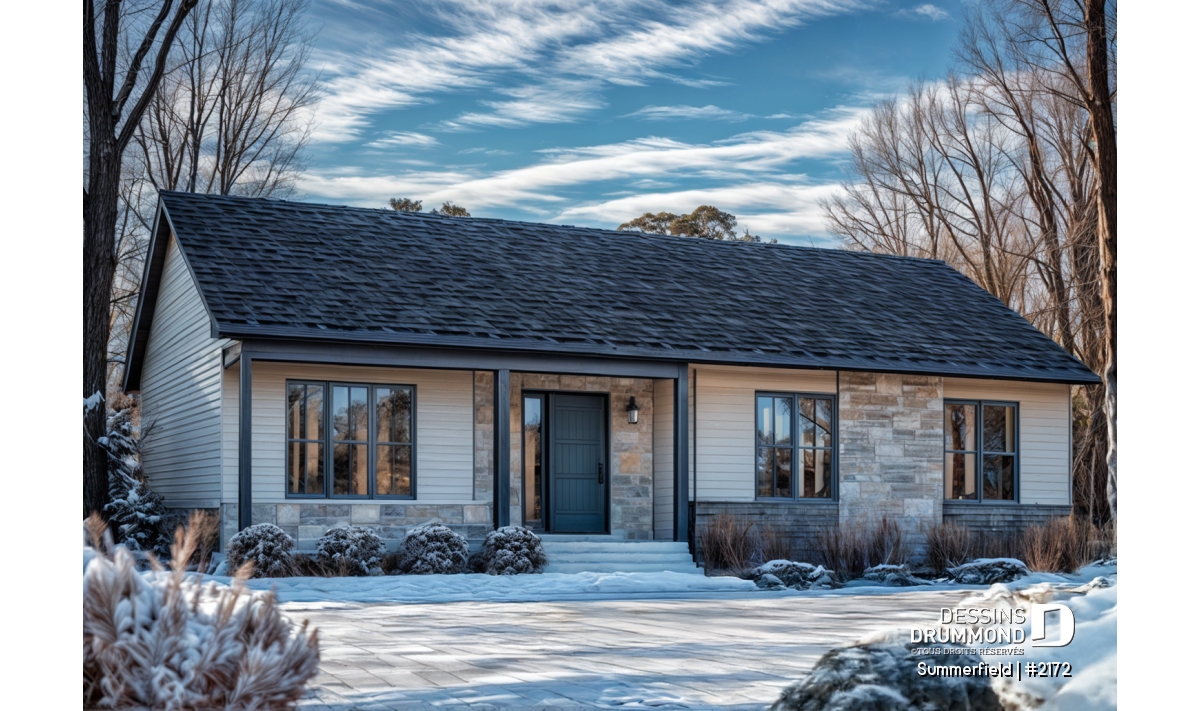 Ce plain-pied de style ranch séduit par son allure simple, chaleureuse et intemporelle. Sa façade élégante, rehaussée d’une touche de pierre naturelle et d’un choix de couleurs sobres, confère à cette maison un caractère à la fois rustique et raffiné. Son architecture compacte et bien proportionnée en fait un choix idéal pour les auto-constructeurs à la recherche d’un projet abordable, bien pensé et facile à réaliser.