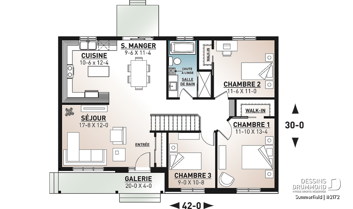 Ce modèle propose trois chambres bien proportionnées au rez-de-chaussée, dont une suite des parents confortable avec walk-in, ainsi qu’une chambre secondaire également dotée d’un walk-in — un atout rare dans cette catégorie de maisons. La salle de bain complète comprend un bain et une douche séparés, en plus d’une chute à linge pratique reliant directement la salle de lavage.