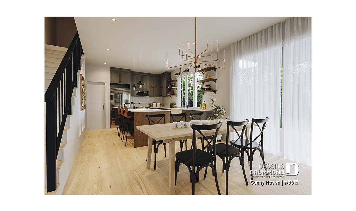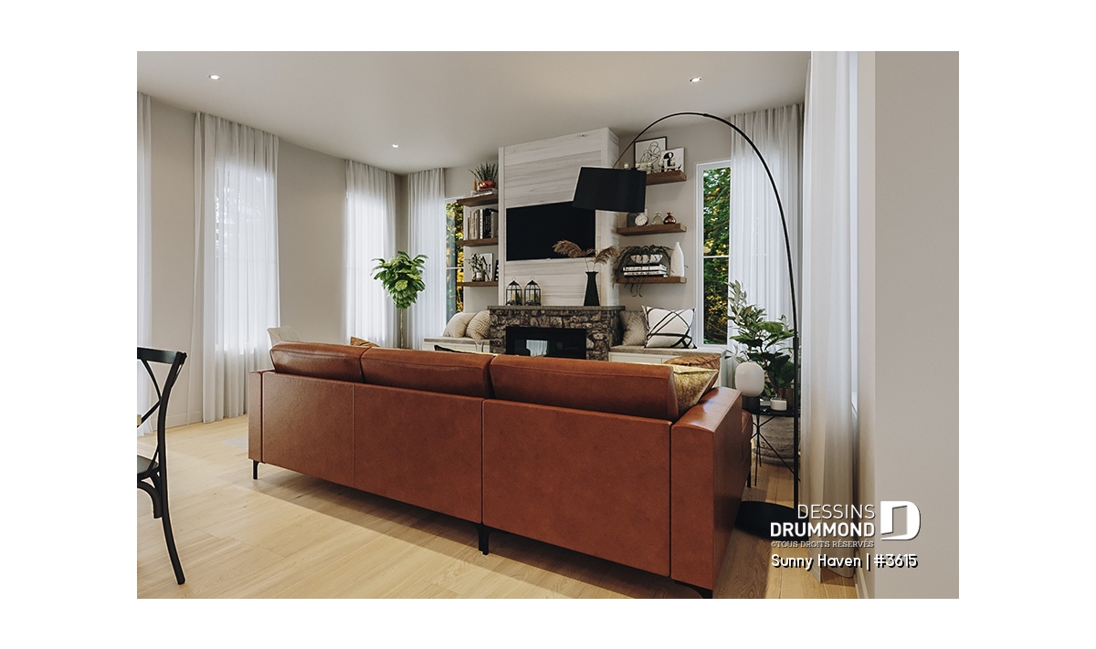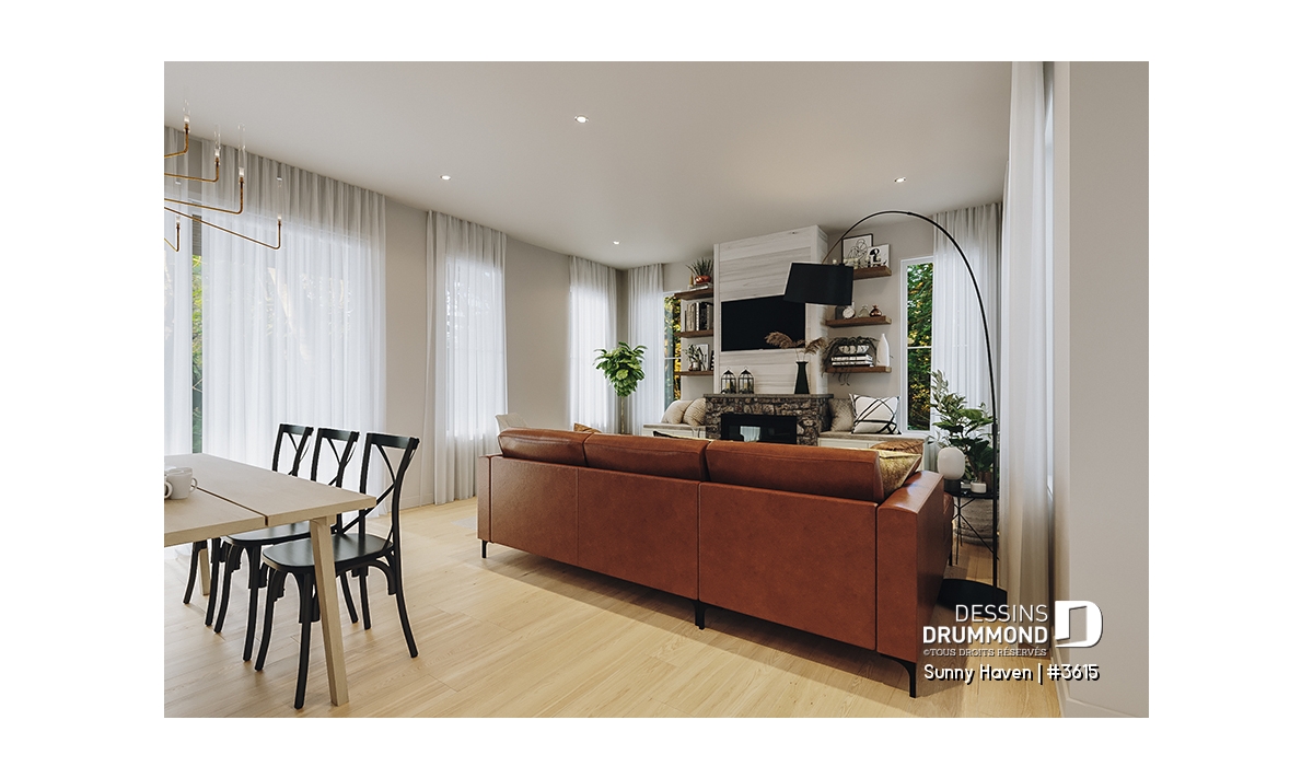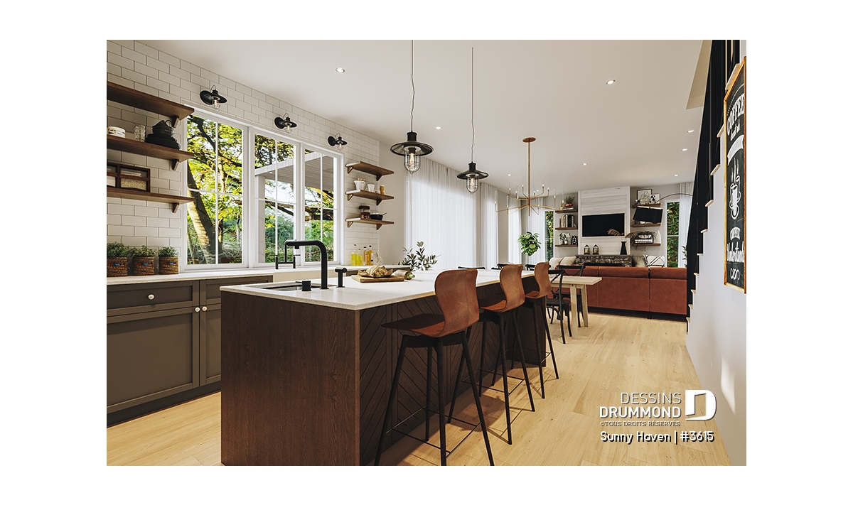 Le cœur de Sunny Haven (#3615) se trouve dans son aire de vie ouverte, où la cuisine, la salle à manger et le salon cohabitent dans une ambiance lumineuse et conviviale. La cuisine se distingue par son grand îlot central, son garde-manger généreux et un espace prévu pour un cellier, répondant autant aux besoins pratiques qu’au plaisir de recevoir. Le salon, agrémenté d’un foyer avec mobilier intégré, devient un lieu de rassemblement naturel, propice aux moments partagés.