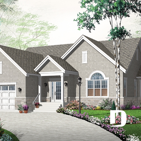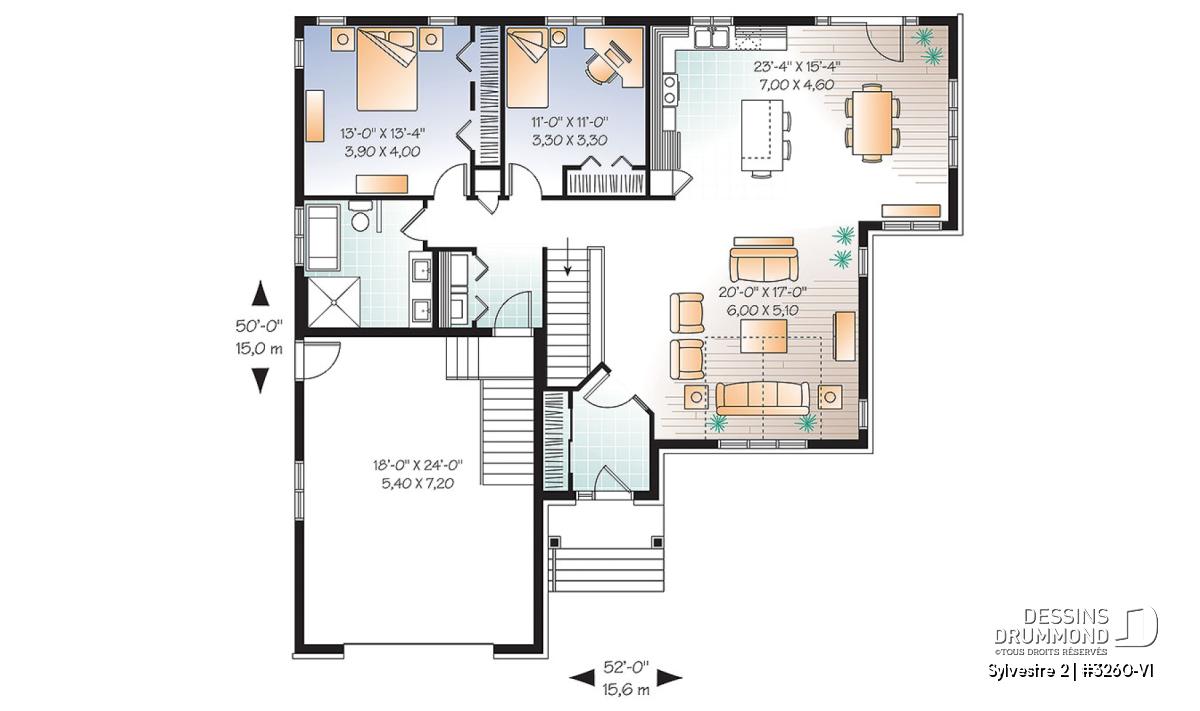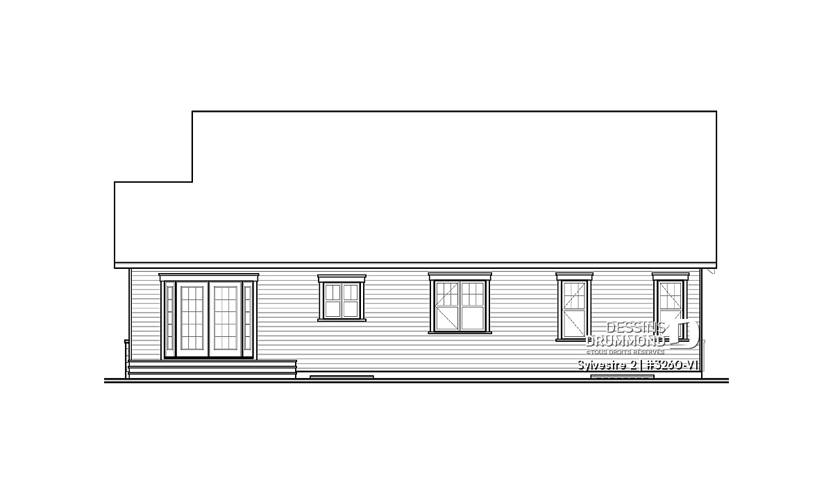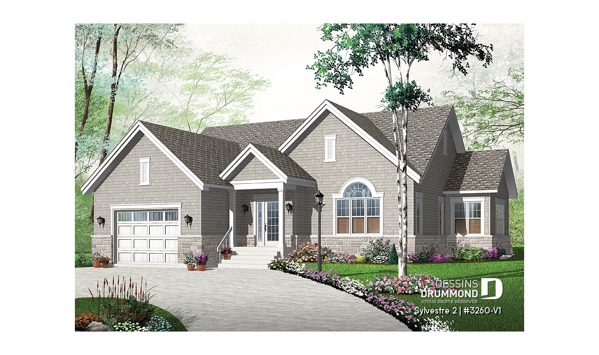 Comme bien des gens, vous avez craqué pour le bungalow 3260 de la collection de maisons neuves de Dessins Drummond et n’avez pas encore acheté votre plan ? Appréciez donc cette version agrandie de 245 pi2 ( équivalent d’une pièce additionnelle de 15’ x 16’ ) pour le rez-de-chaussée et de tout près de 120 pi2 ( équivalent de 10’ x 12’ ) pour le garage.