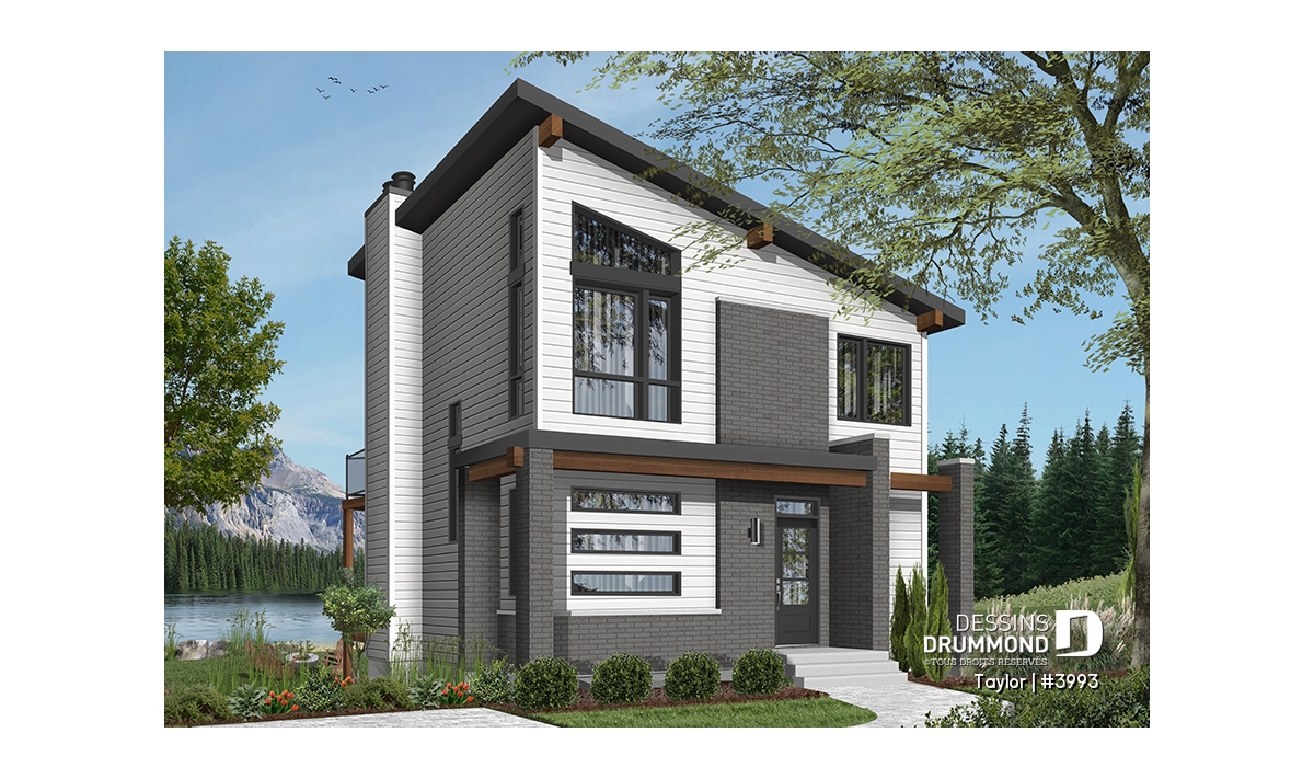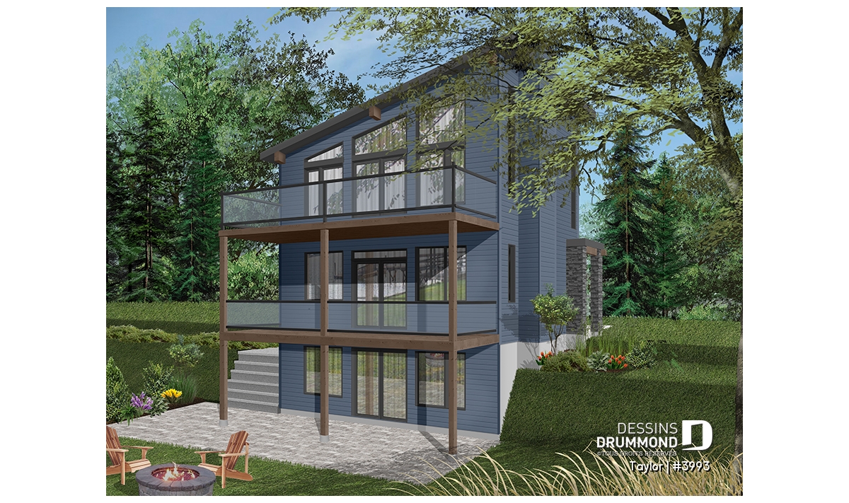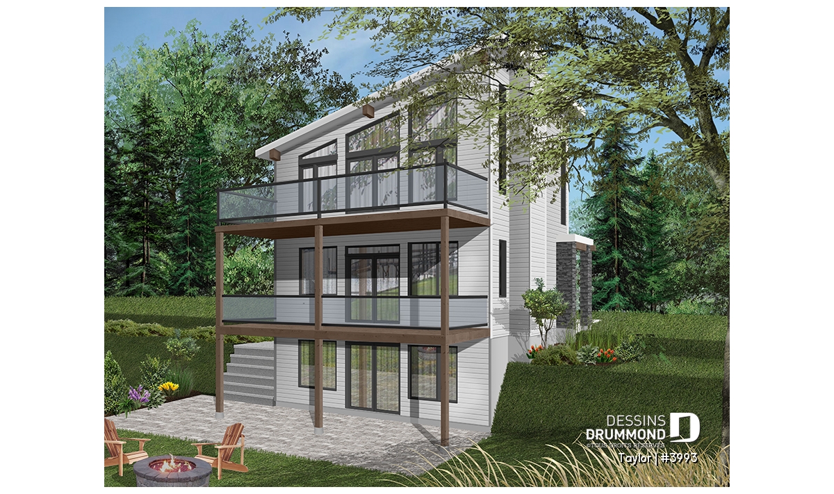 Le nouveau plan de chalet contemporain de Dessins Drummond (plan # 3993) aussi nommé « Taylor », charme dans un premier temps par la quantité impressionnante de fenêtres et portes qu’il offre aux futurs propriétaires. Ces ouvertures ainsi proposées permettent une maximisation de la lumière naturelle et ce dans plusieurs pièces clé de la maison, soit le secteur activités à l’arrière, ainsi qu’à la chambre des maîtres. Que ce soit à la campagne en bordure d’un boisé, au bord d’un lac ou d’une rivière, ou en montagne, le nouveau plan de chalet de Dessins Drummond « Taylor » vous fera profiter au maximum des vues disponibles de votre nouveau terrain.