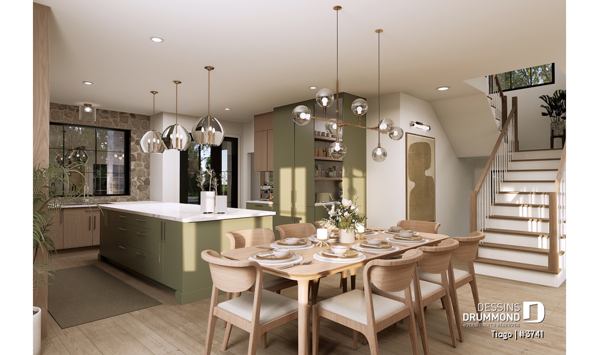 Dès l’entrée, vous serez accueilli par un spacieux vestiaire sur la droite et un banc pratique sur la gauche. Le salon, chaleureux et convivial, est agrémenté d’un foyer et peut accueillir plusieurs aménagements de soffas et fauteuils. La cuisine à aire ouverte donne sur la salle à manger et met en valeur un trio très prisé : garde-manger, cellier et grand îlot central. Un bureau, idéal pour le télétravail, complète cet espace et peut aisément être transformé en salle de jeux pour les enfants. Une salle d’eau, située à mi-palier vers le sous-sol, vient parfaire cet étage.