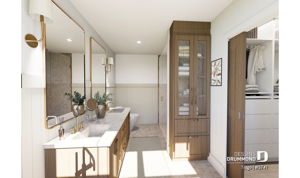 L’étage est un véritable cocon pour la famille. La chambre des maîtres séduit par son walk-in spacieux et sa salle de bain privée digne d’un hôtel : bain autoportant devant une grande fenêtre, douche spacieuse et double lavabo pour un maximum de confort. Deux chambres secondaires, une seconde salle de bain complète, une salle de lavage et une grande penderie complètent cet étage fonctionnel et bien pensé.
