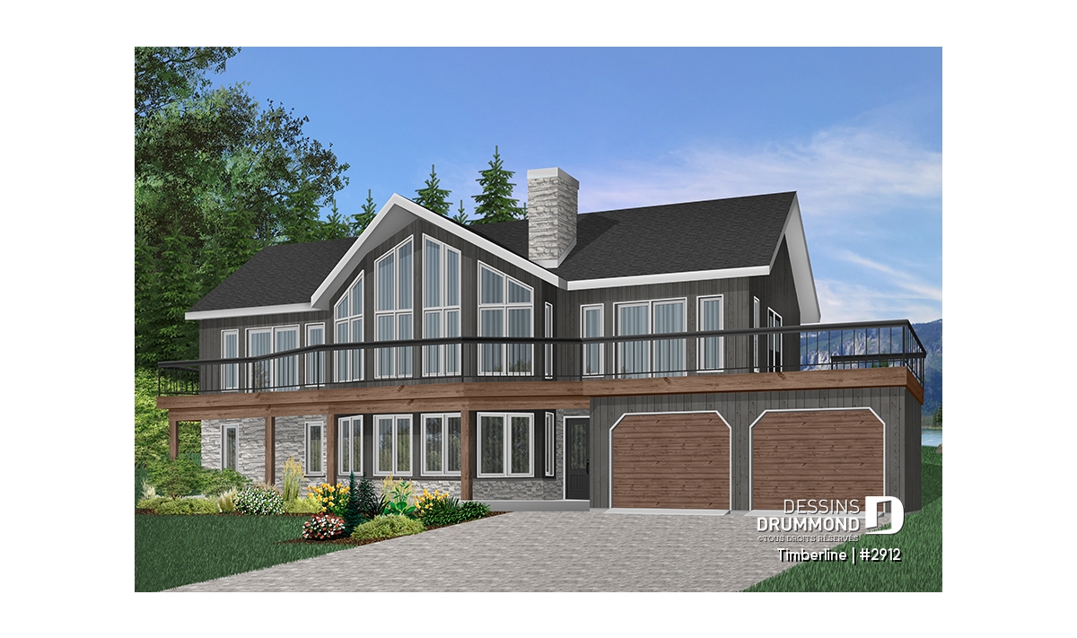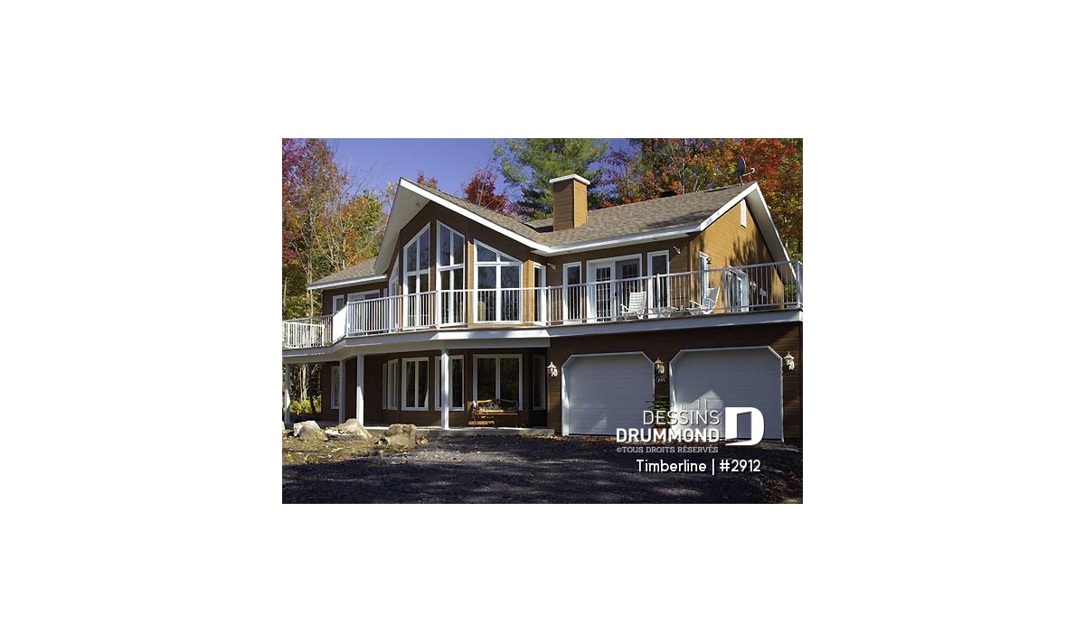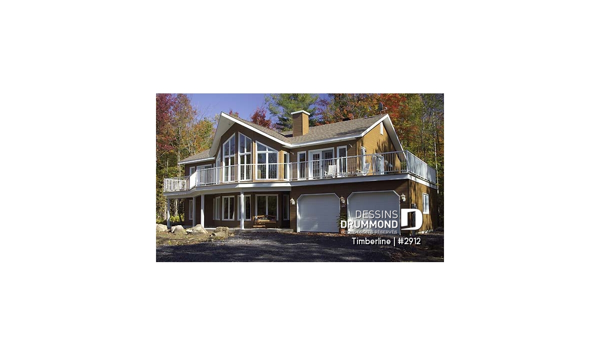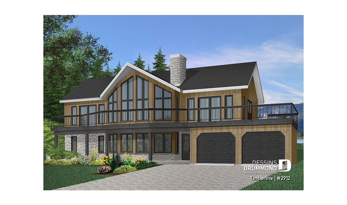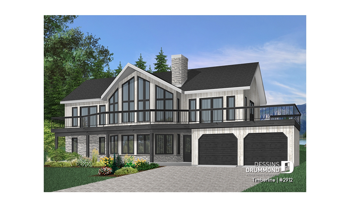 Plafond cathédrale prévu à la salle de séjour dotée aussi d'un foyer deux faces ouvert sur la salle à manger. Cuisine avec garde-manger en coin et îlot-lunch central. Suite des maîtres prévue au rez-de-chaussée. Salle familiale avec foyer. Cinq chambres prévues au plan. Garage double avec terrasse au-dessus.