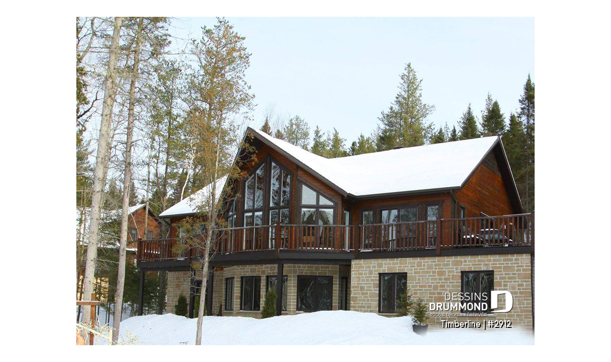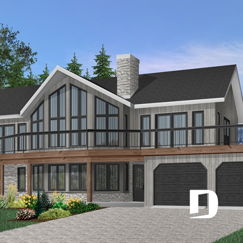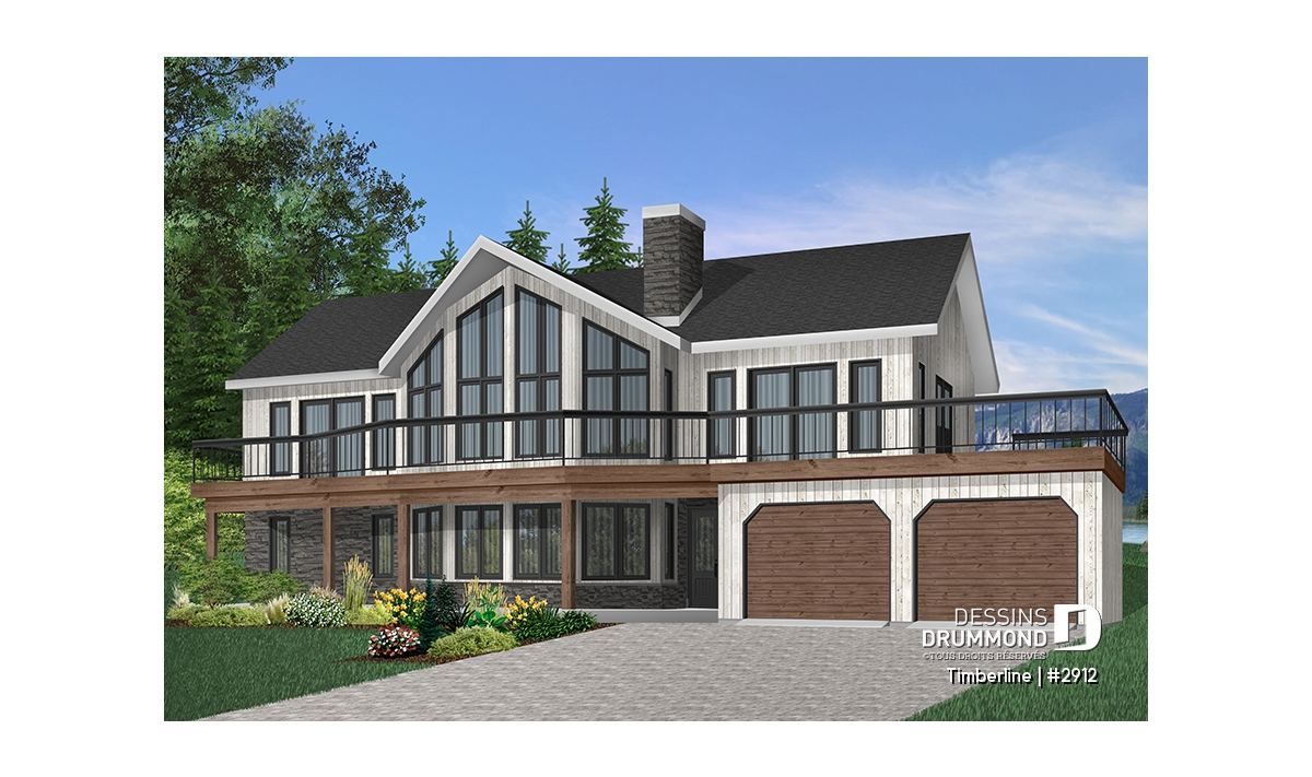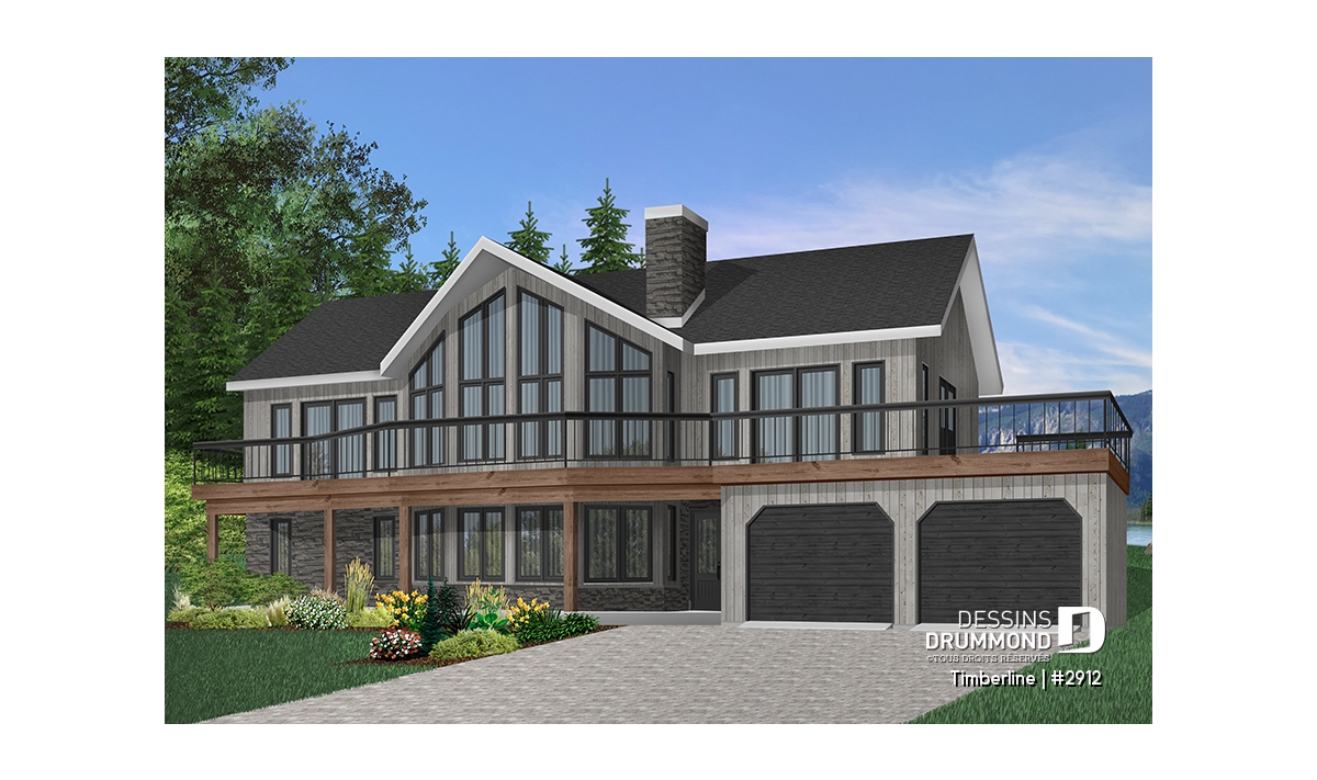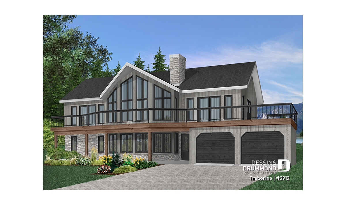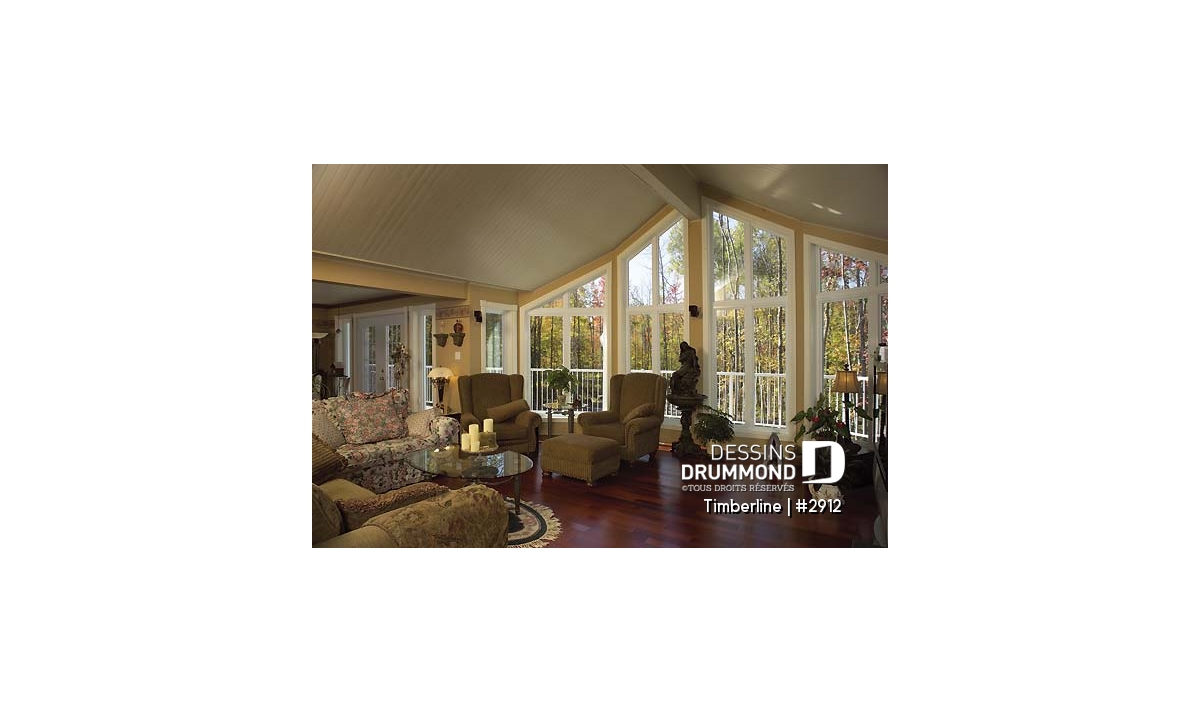 Plafond cathédrale prévu à la salle de séjour dotée aussi d'un foyer deux faces ouvert sur la salle à manger. Cuisine avec garde-manger en coin et îlot-lunch central. Suite des maîtres prévue au rez-de-chaussée. Salle familiale avec foyer. Cinq chambres prévues au plan. Garage double avec terrasse au-dessus.