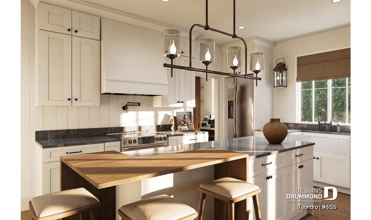 La cuisine, véritable cœur de la maison, se veut conviviale et inspirante. Son garde-manger fonctionnel et son grand îlot central invitent à la préparation de bons repas tout en favorisant les échanges. Ouverte sur la salle à manger et le salon, elle fait partie d’un vaste espace de vie idéal pour recevoir famille et amis dans une atmosphère accueillante et chaleureuse.