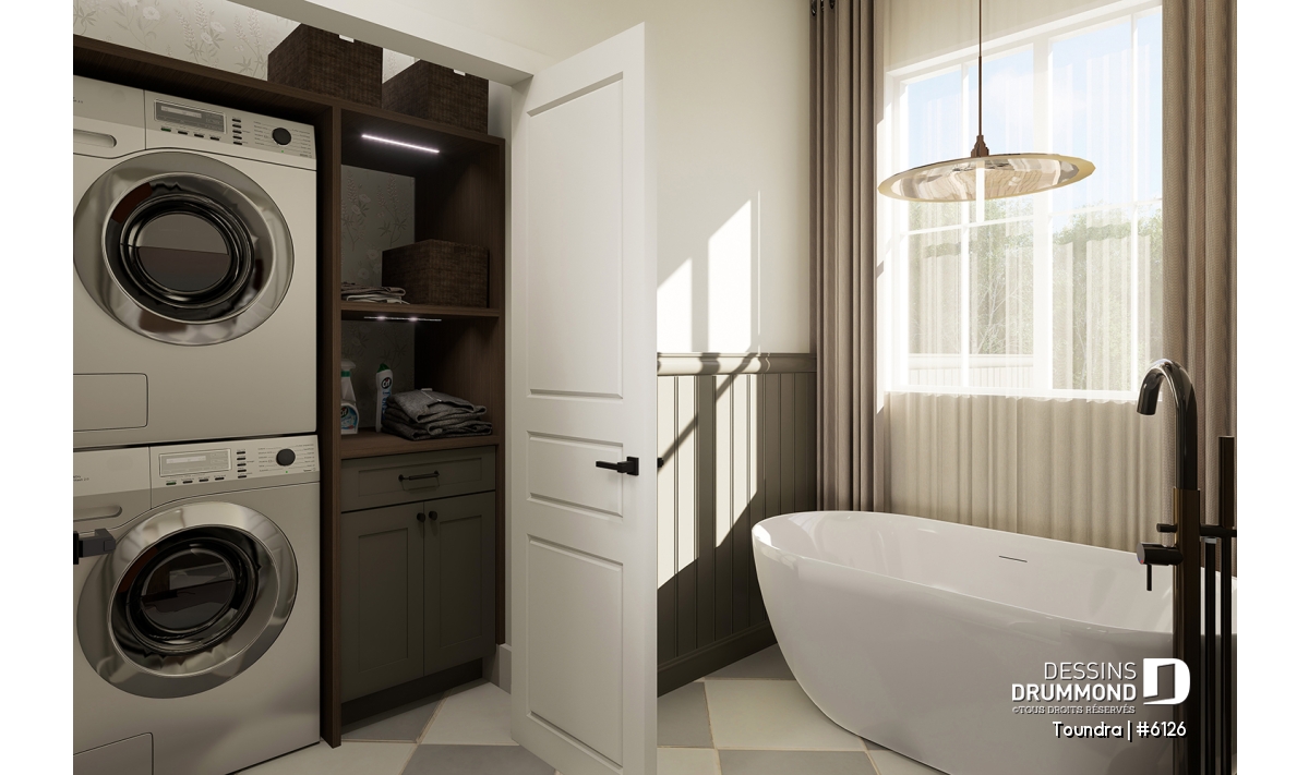 La salle de bain spacieuse a tout pour plaire : bain autoportant pour les moments de détente, douche indépendante vitrée, double lavabo et un coin laveuse/sécheuse superposées, ingénieusement intégré pour un maximum d’efficacité.