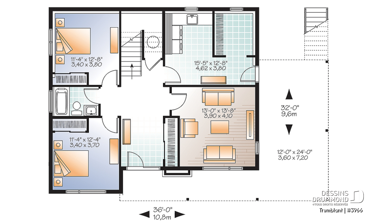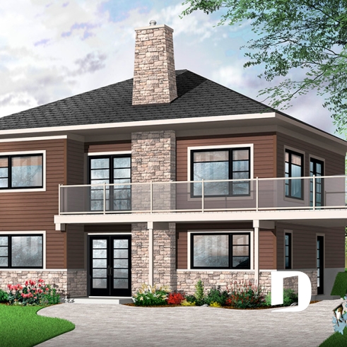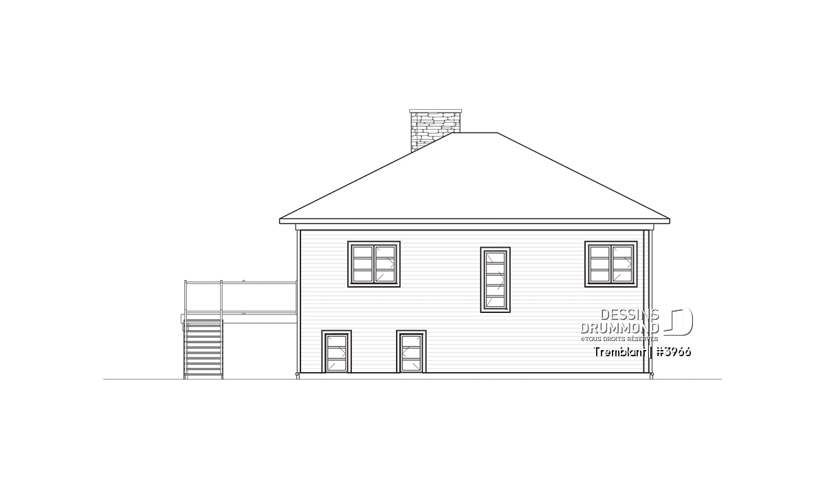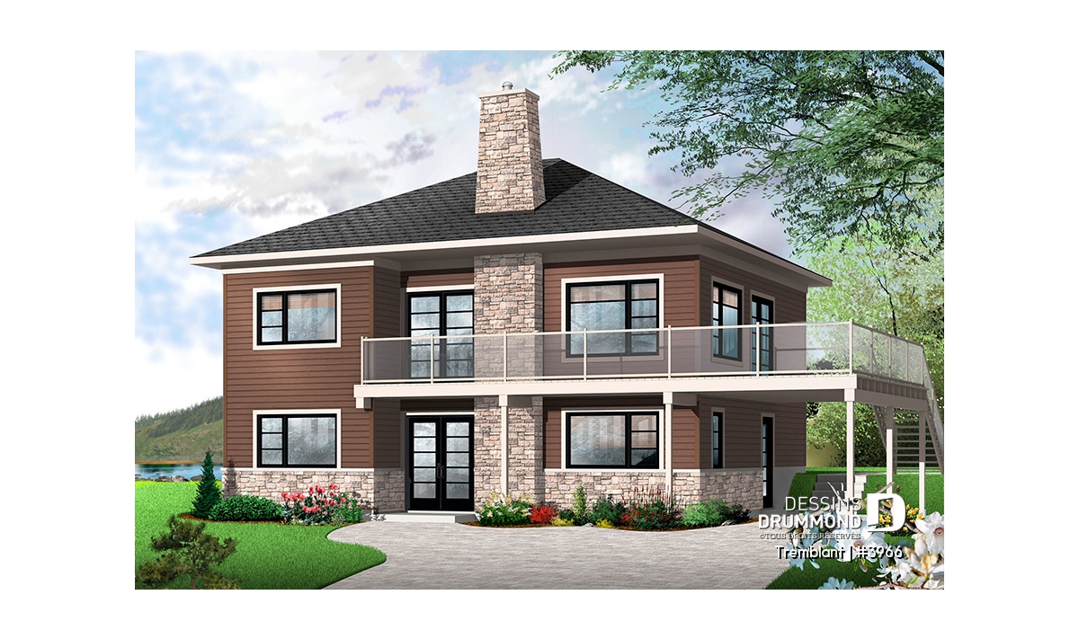 Conçu à partir du plan original 2955, ce plan 3966 lui emprunte en partie son aménagement intérieur tout en revisitant sont extérieur pour l’obtention d’un cachet contemporain. Ici, le concepteur suggère un abri d’auto qu’il combine à une vaste terrasse afin de permettre aux propriétaires de profiter à plein de la vue panoramique s’offrant à eux. Entrons donc sans plus tarder!