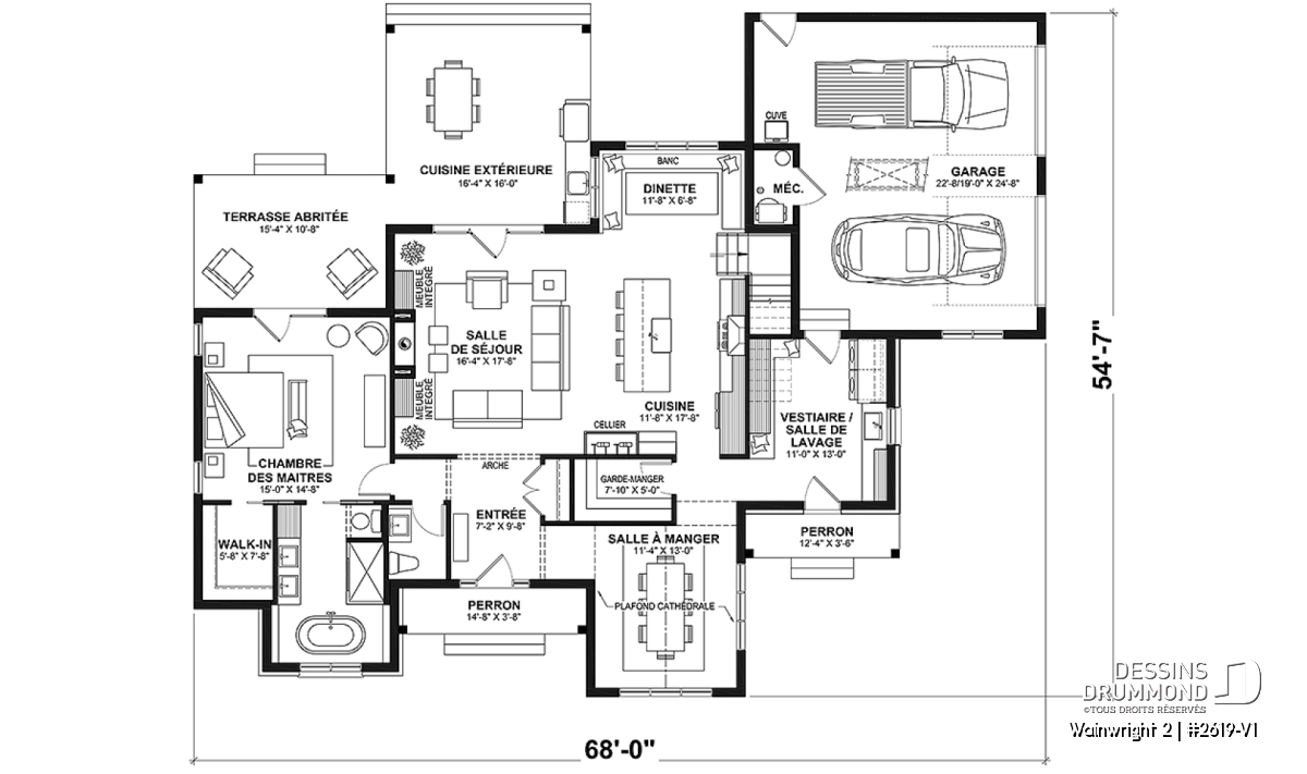 Accès au garage par le côté, Foyer, Garage latéral, Garde-manger, Ilôt, Salle de lavage au rez-de-chaussée, Salle à manger formel, Suite des maîtres au rdc, Terrasse abritée, Walk-in ch. maîtres, Vestiaire, Cellier, Plafond à plus de 8', Plafond cathédrale, Banquette, Bureau / Salle étude, Bain et douche séparés, Lavabo double, Vue paronamique, Arche