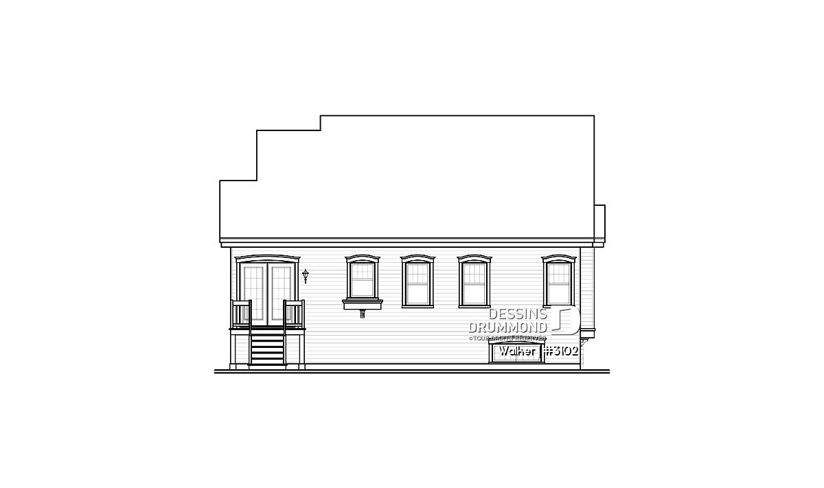 Toujours dans cette lignée de nouveaux plain-pied, Dessins Drummond vous propose ici deux versions intérieures pour un extérieur quasiment semblable et passablement distinct. L’usage de brique-pierre à la base de celui-ci et sur un mur-pignon, en façade, combiné à un déclin champêtre et un escalier fort invitant, confère à ce modèle un cachet plutôt unique. Fait à noter ici : avec la façon dont DDI réalise ses plans, il est facile de prolonger le parement léger extérieur ( en l’occurrence ce déclin bourgogne ) sans complication et par dessus la fondation, pour amplifier la maison, la rendre davantage esthétique et éviter l’application d’agrégat.