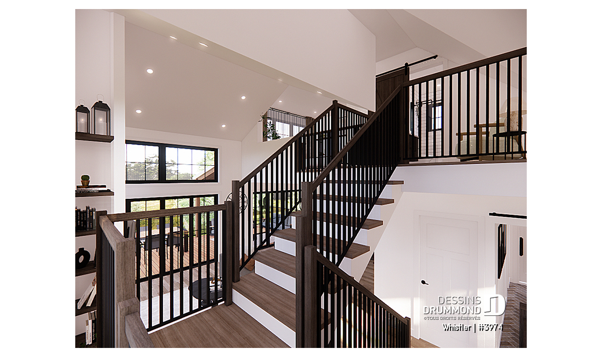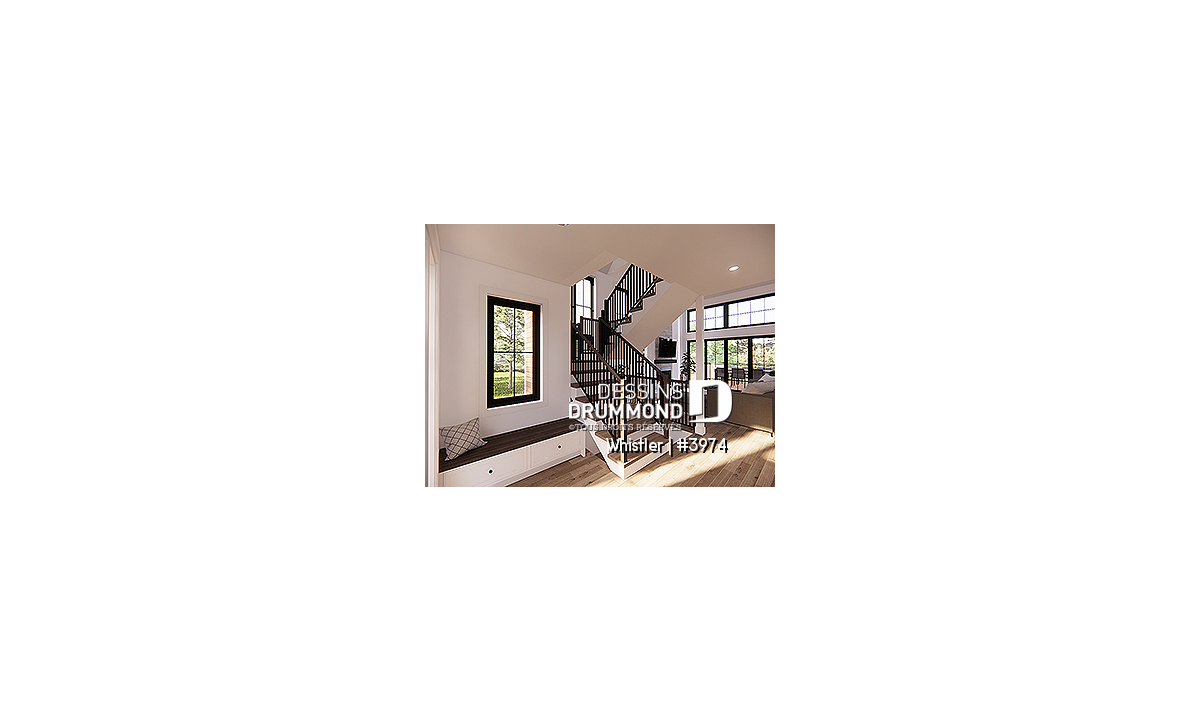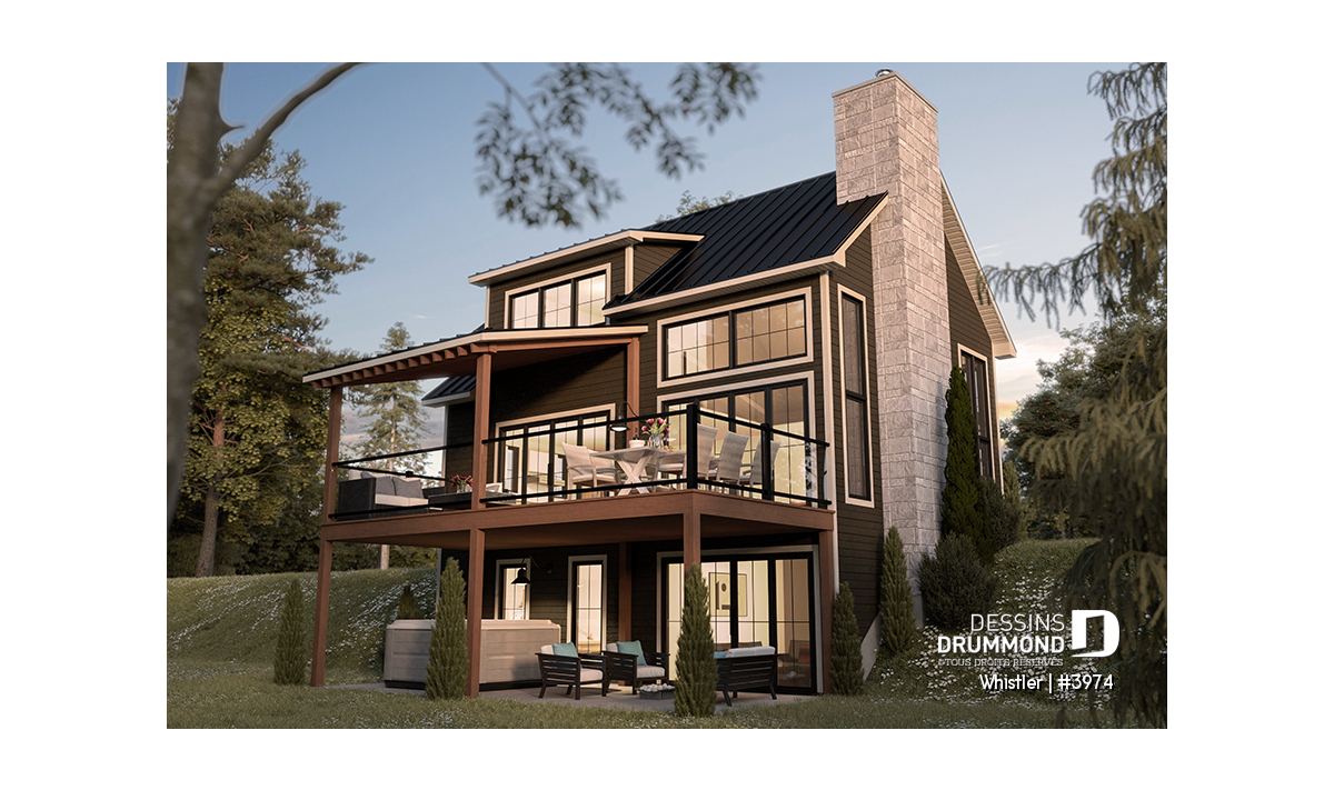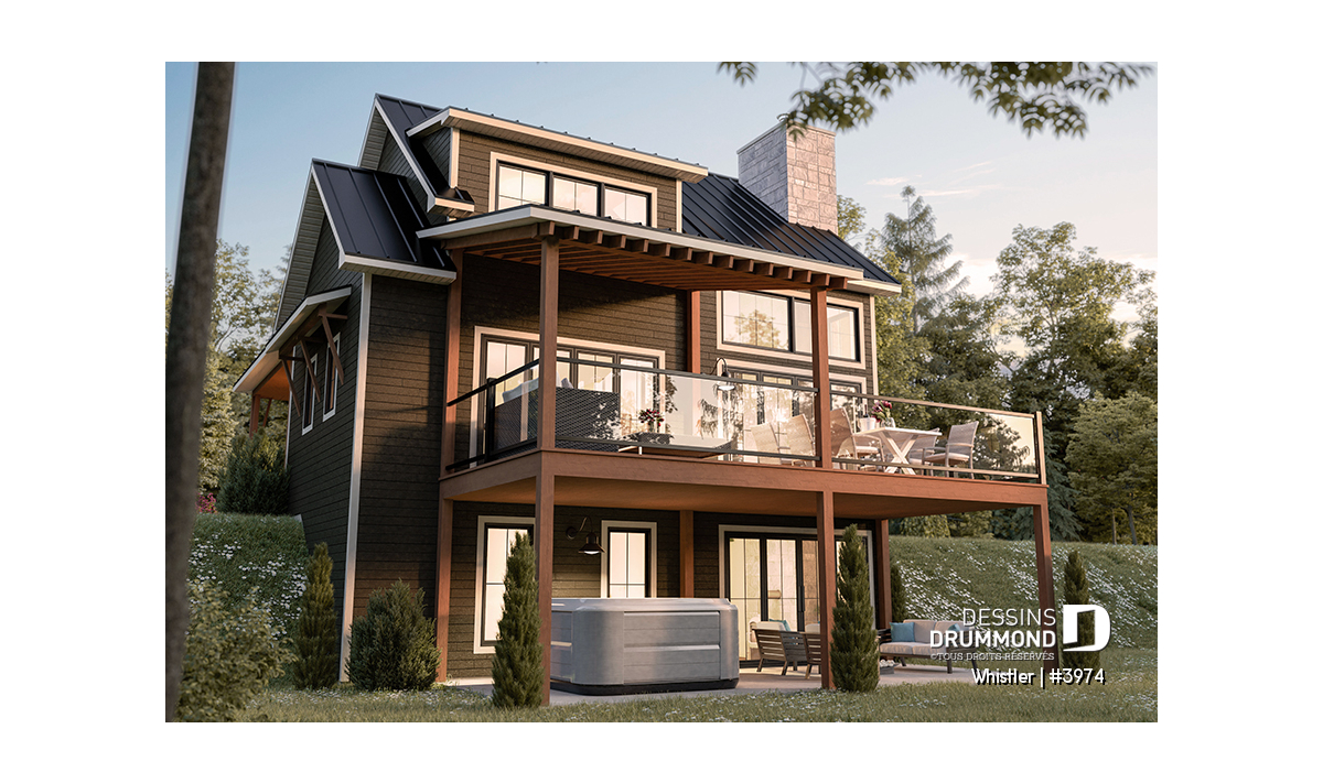 Le plan de maison WHISTLER (#3974) est remarquable pour son look petite maison rustique et chalet de ski à la fois. Aménagé sur 3 étages, avec fondation en rez-de-jardin, il offre cependant tous les espaces requis pour une famille de 4 personnes!