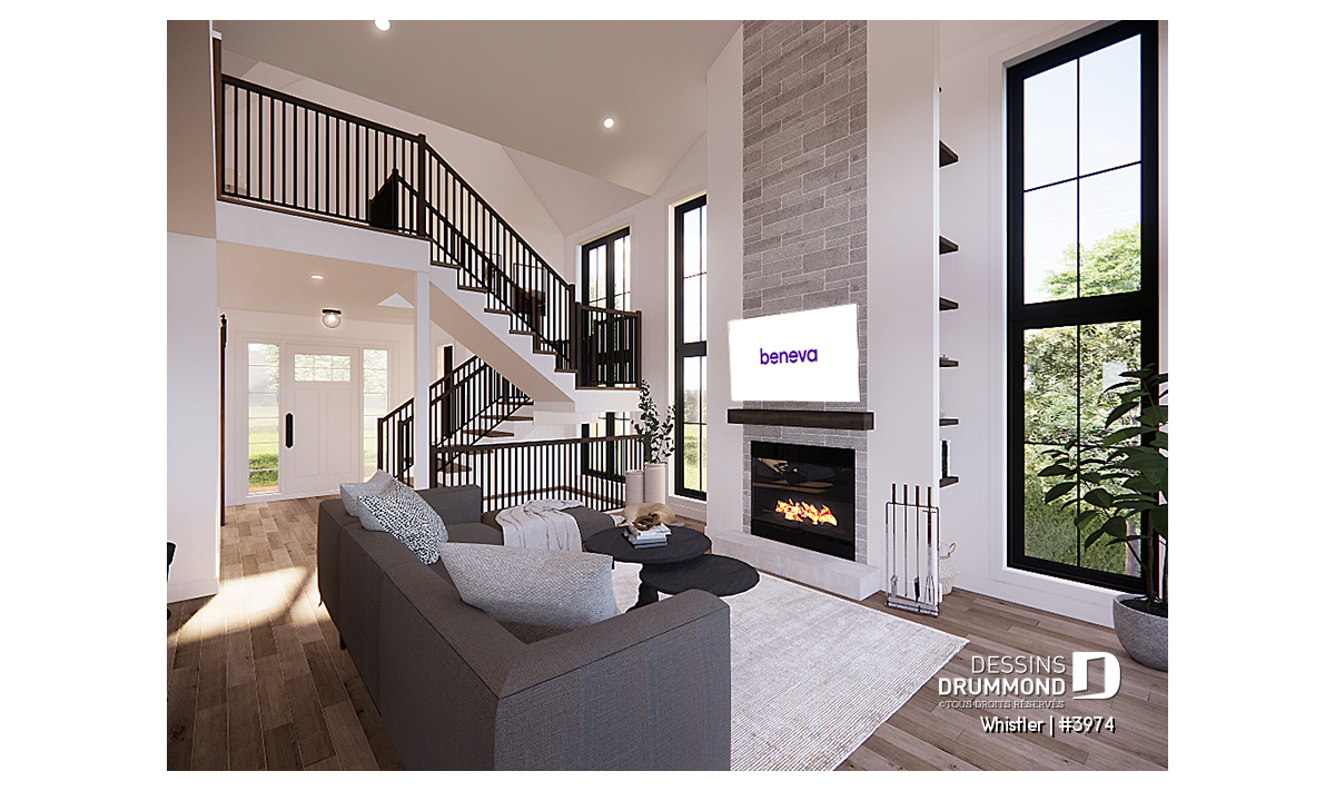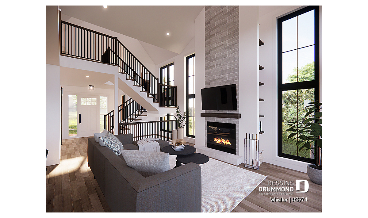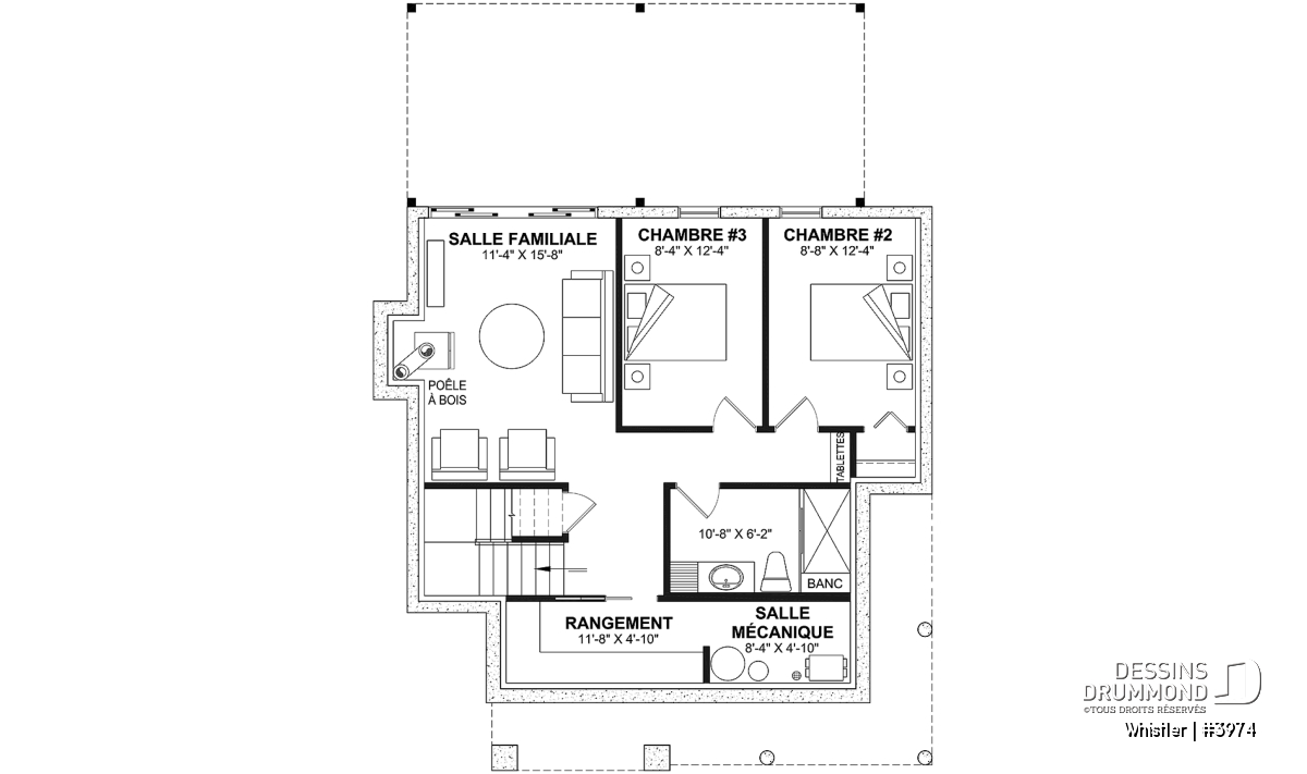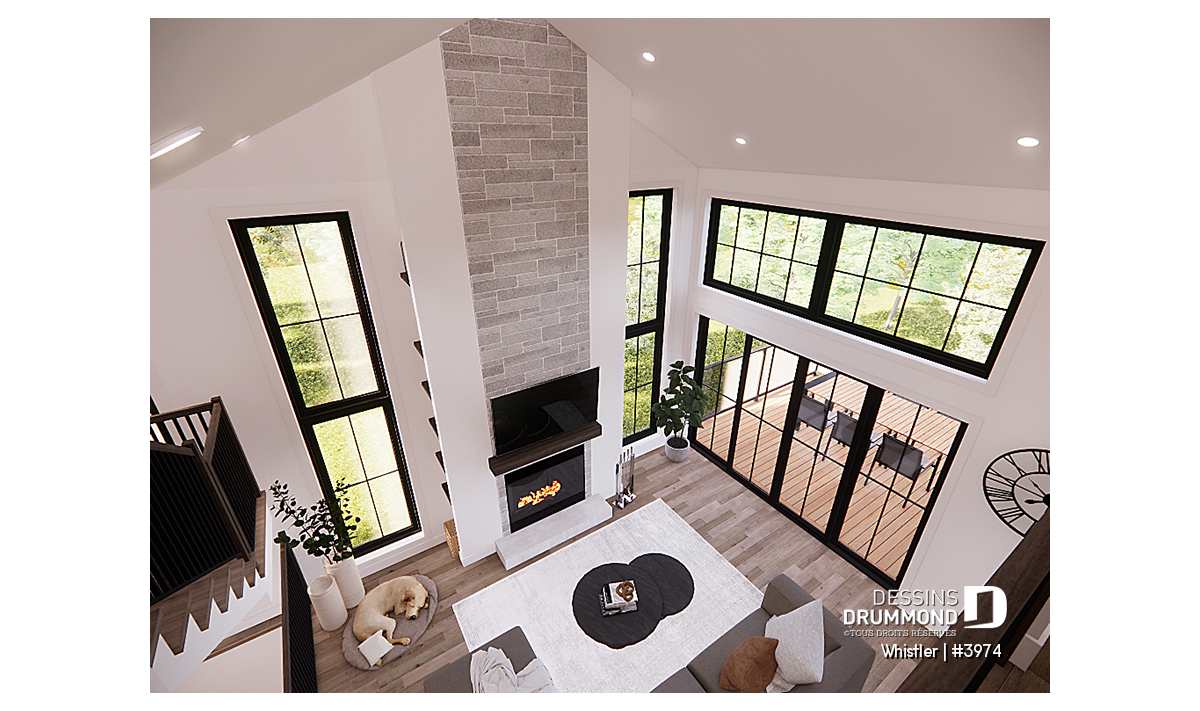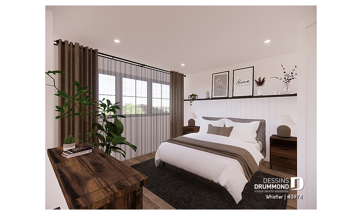 Le plan de maison WHISTLER (#3974) est remarquable pour son look petite maison rustique et chalet de ski à la fois. Aménagé sur 3 étages, avec fondation en rez-de-jardin, il offre cependant tous les espaces requis pour une famille de 4 personnes!