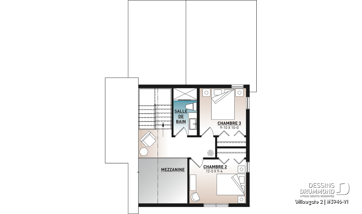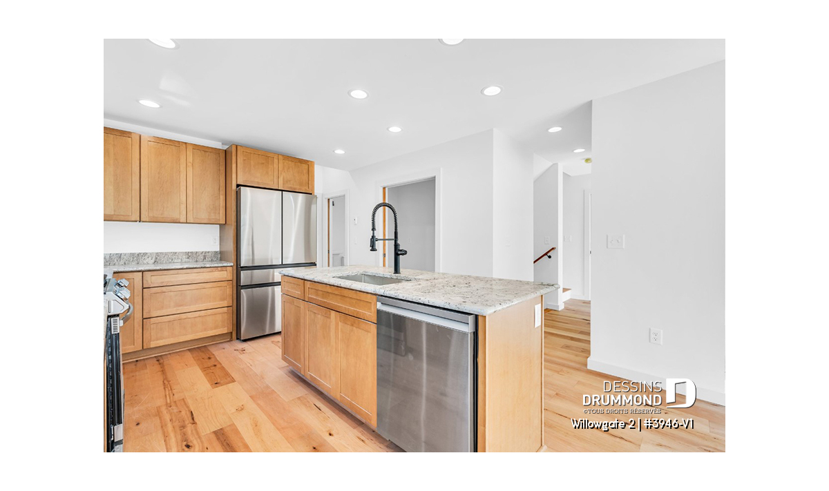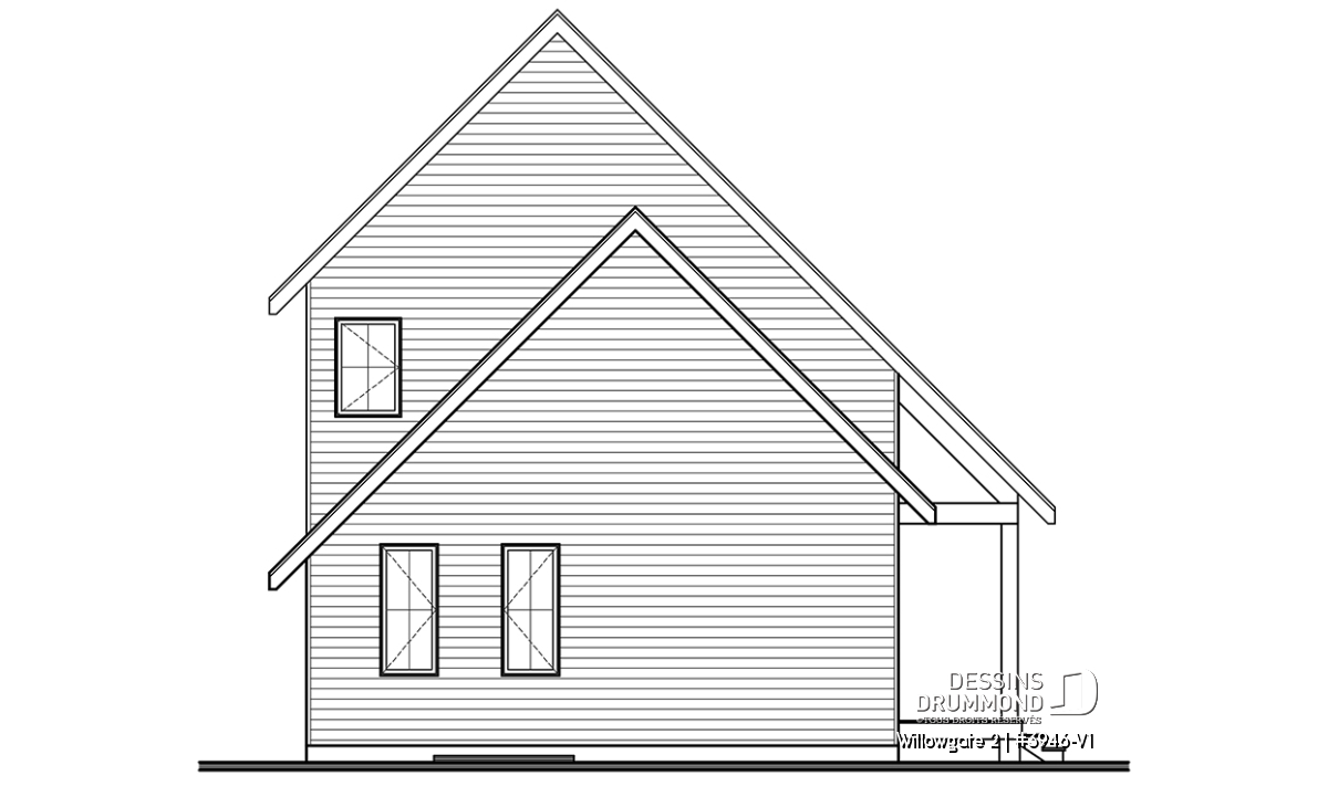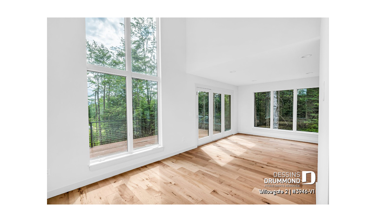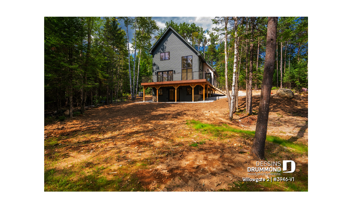 Le plan de maison WILLOWGATE 2 (#3946-V1), un chalet moderne de 3 chambres, style scandinave, propose 1 512 pieds carrés avec une fenestration abondante. Le plafond cathédrale partiel dans la salle de séjour et dans la suite des parents, en offre encore d’avantage en termes de luminosité.