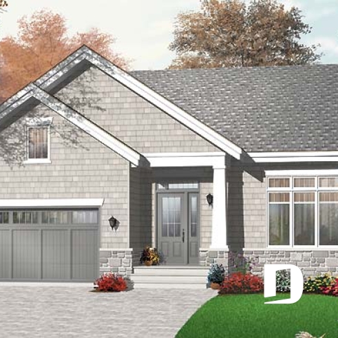 Plan de maison de style Craftsman, salle de séjour avec foyer et coin bureau, chambre maître avec walk-in
