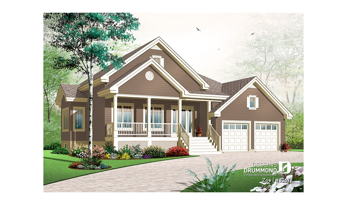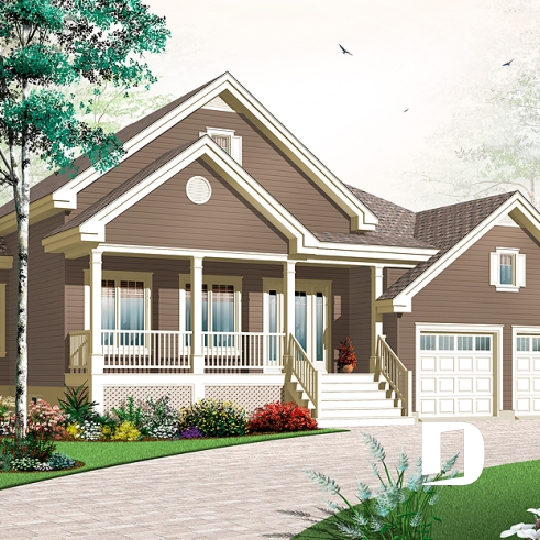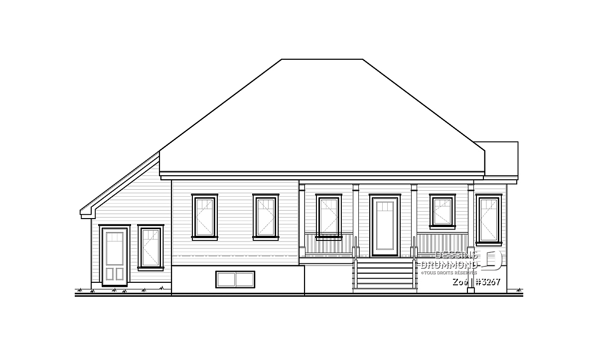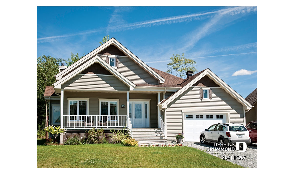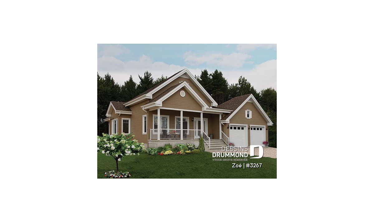 Conçu à partir du modèle 3239, que vous êtes en mesure d’apprécier sur http://www.dessinsdrummond.com/ et pour lequel on désirait proposer un garage double et un plafond à 9 pieds au rez-de-chaussée afin d’aménager de fausses poutres au plafond, ce modèle de plain-pied suggère aussi plein d’atouts qu’on se doit de préciser. Ainsi, à l’extérieur, on remarque la présence d’un large porche abrité en façade principale tout comme celui que l’on est en mesure de percevoir sur l’élévation arrière.